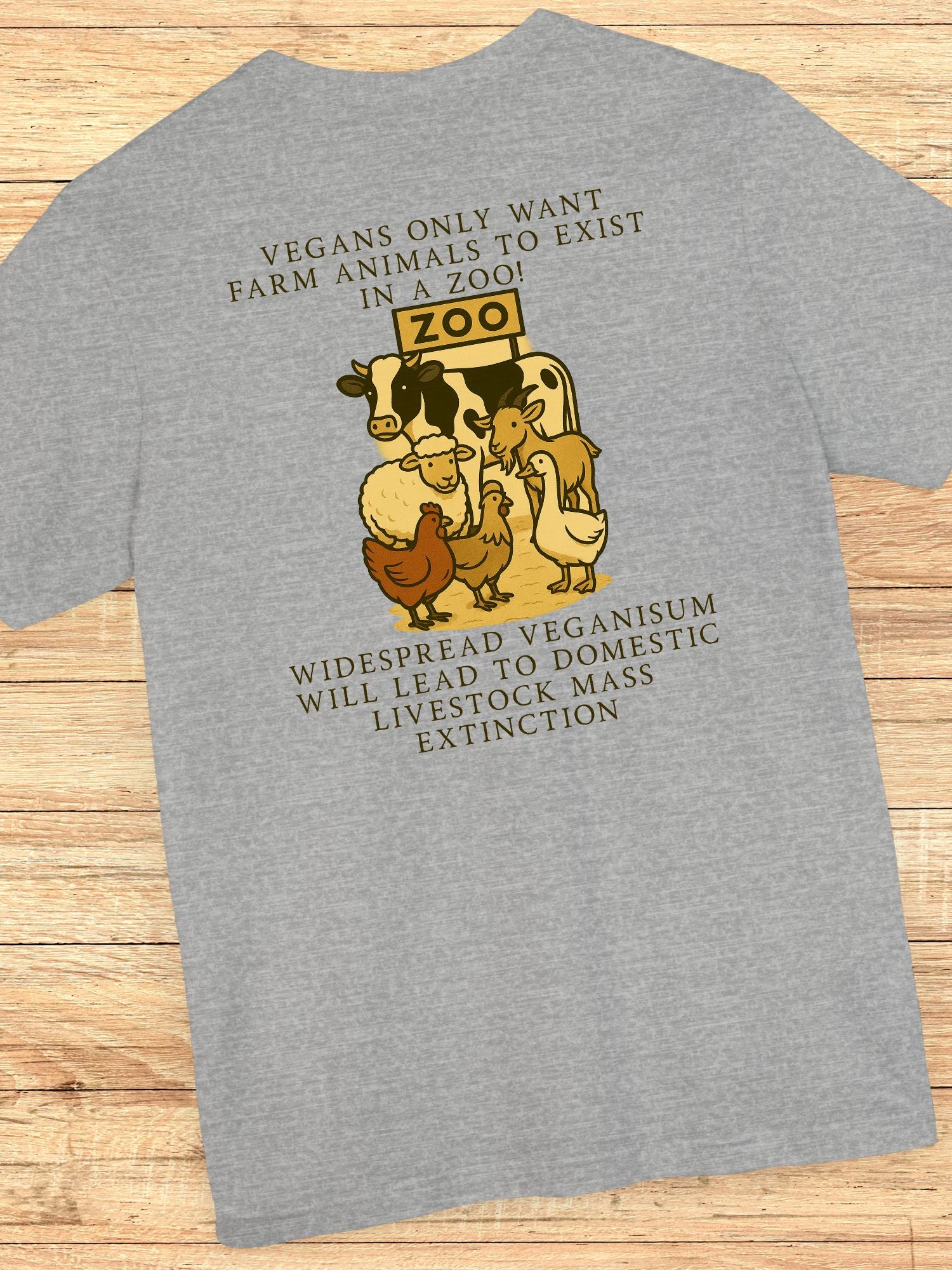 'Vegans only want farm animals to exist in a zoo!' Unisex T-Shirt. Printed on a quality Bella+Canvas 3001 T-shirt.