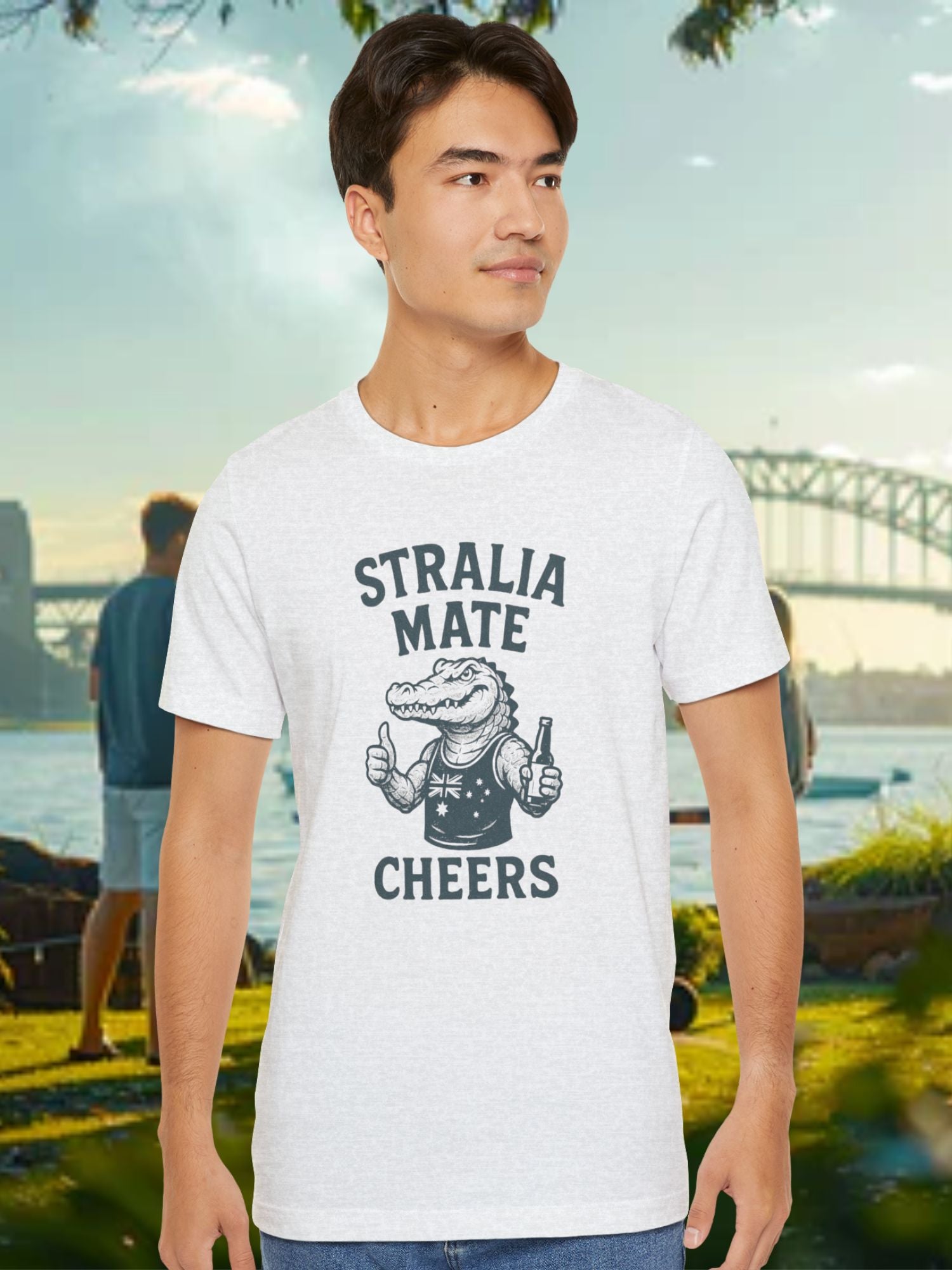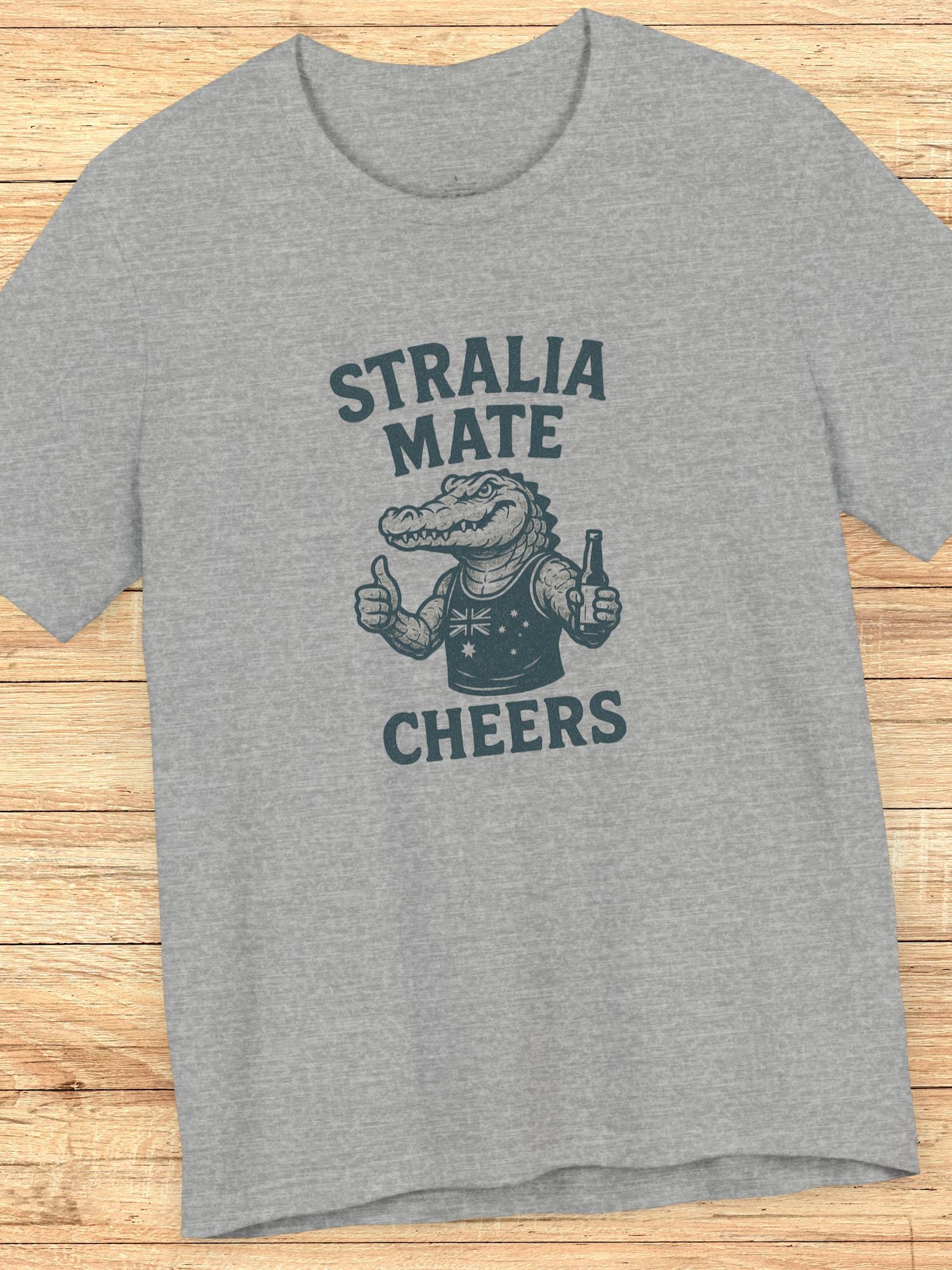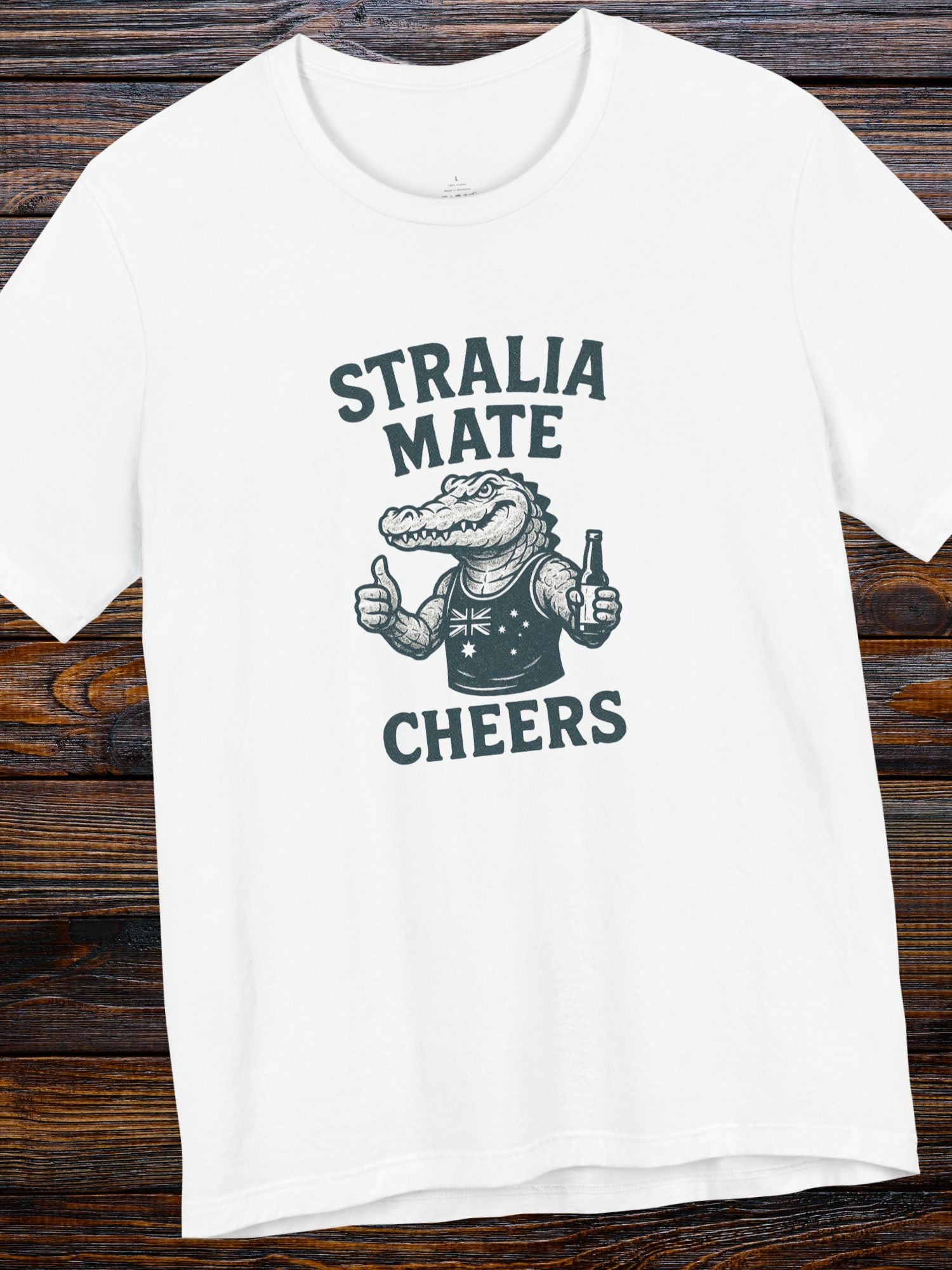'Stralia Mate, Cheers' Aussie Gator Graphic T-Shirt. Celebrate Australian Culture. Printed on a quality Bella+Canvas 3001 T-Shirt.