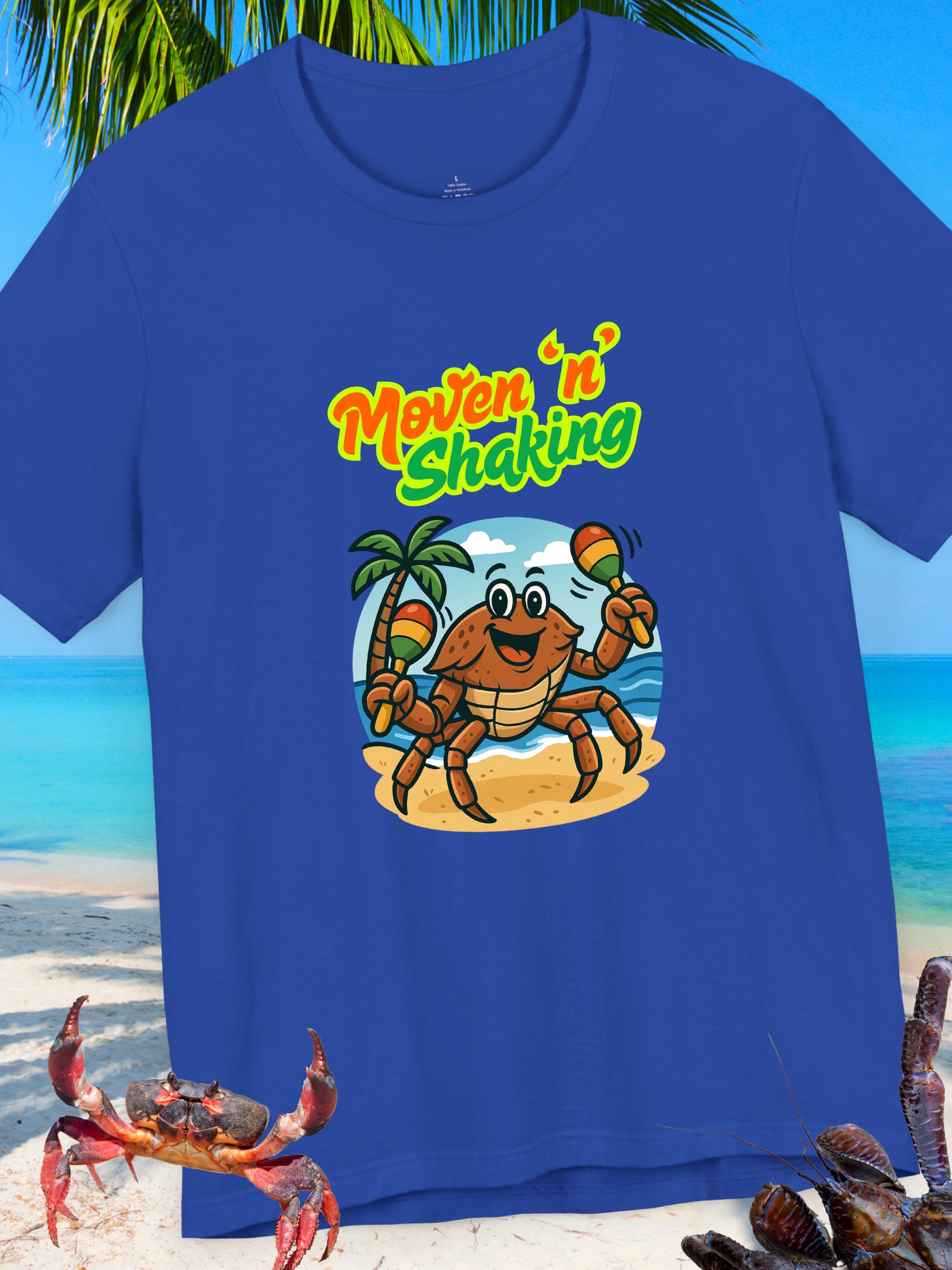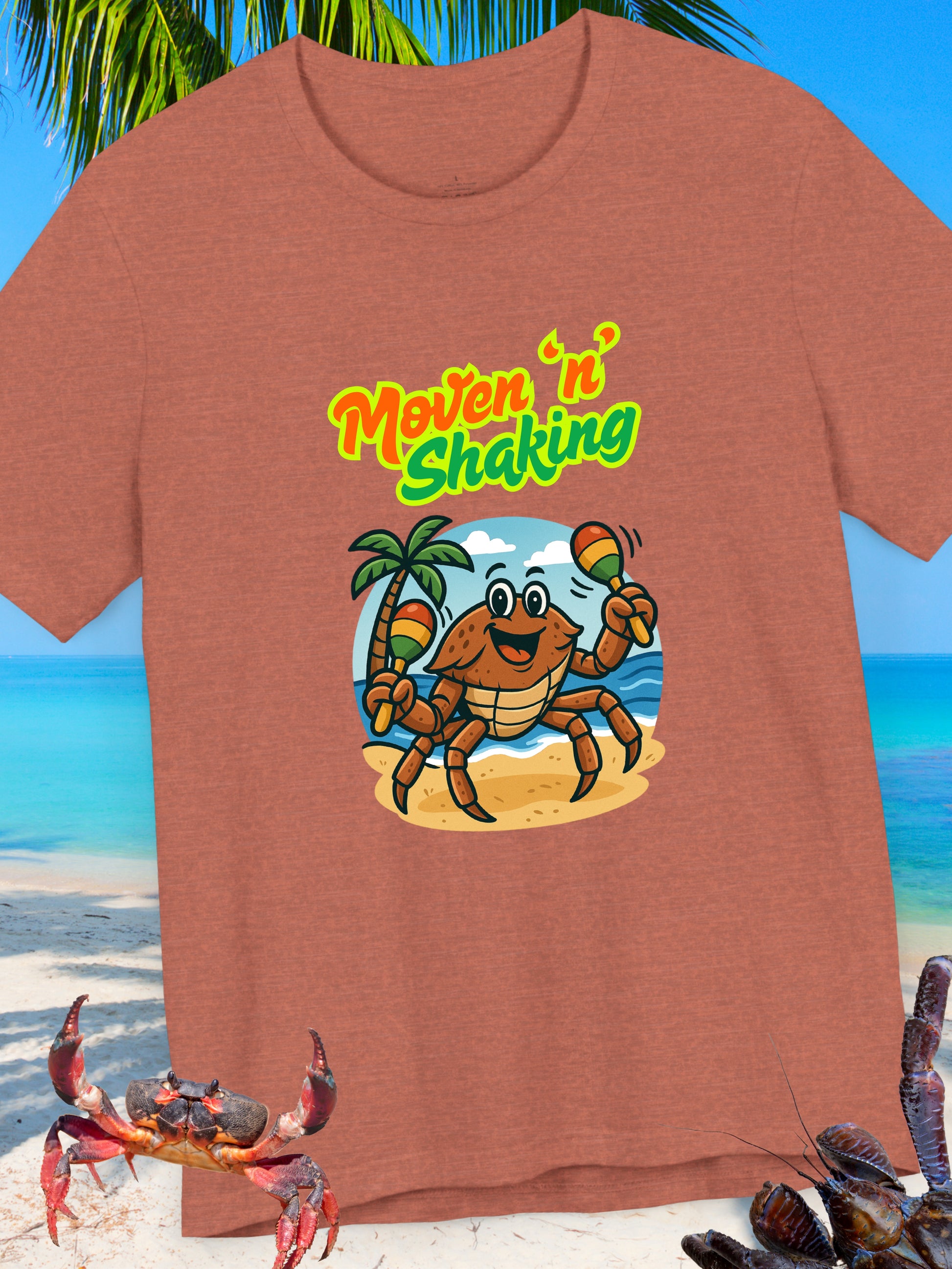 'Moven 'N' Shaking' Coconut Crabby Graphic Unisex T-Shirt. Brighten up your wardrobe with this fun, vibrant Unisex Jersey Short Sleeve Tee! Featuring a playful crab design and bold colors, this tee brings an uplifting beach vibe to any outfit. Made from 100% Airlume combed and ring-spun cotton, it's perfect for casual outings, beach days, or cozy evenings at home. Ideal for adults who love to express their fun side, this shirt makes a great gift for ocean lovers and is sure to be a hit at summer festivals, birthdays, or just a day out in the sun! Dress it up or down, this versatile tee is a must-have for anyone looking to add a playful touch to their style. Printed on a quality Bella+Canvas 3001 T-Shirt.