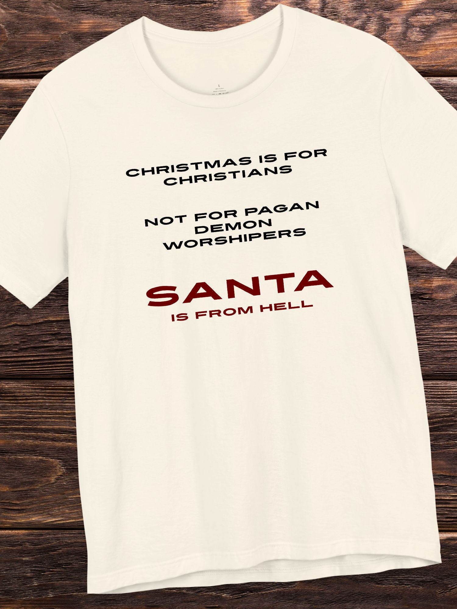 Christmas is for Christians, not for pagan demon worshipers, Santa is from hell' Unisex T-Shirt. Printed on a quality Bella+Canvas 3001 T-Shirt.