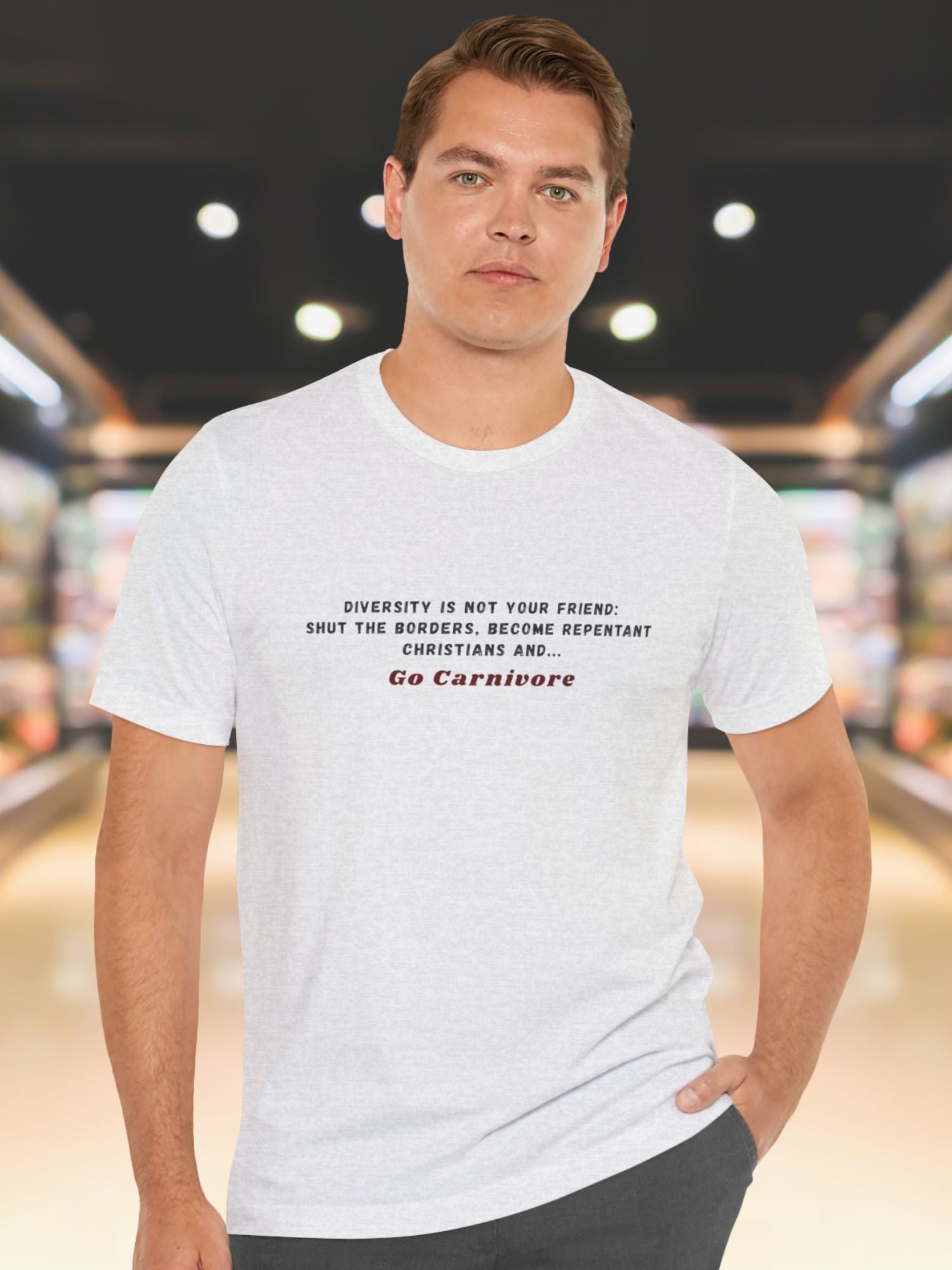 'Diversity is not your friend: Shut the borders, become repentant Christians and... Go Carnivore' Unisex T-Shirt, Christian Apparel, Carnivore Diet, Health and Wellness