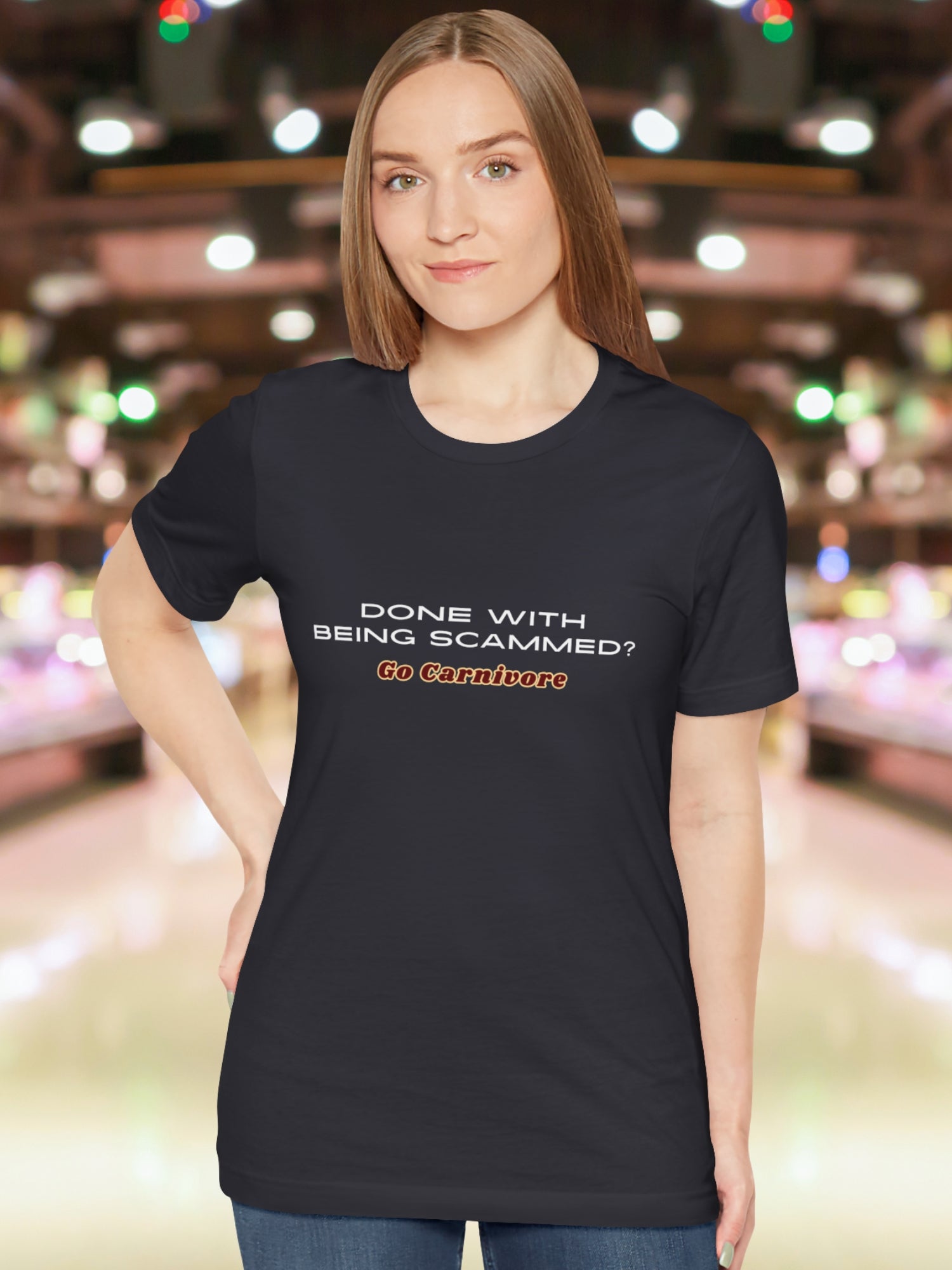 Done With Being Scammed? Go Carnivore Unisex T-Shirt. Printed on a quality Bella+Canvas 3001 T-Shirt.