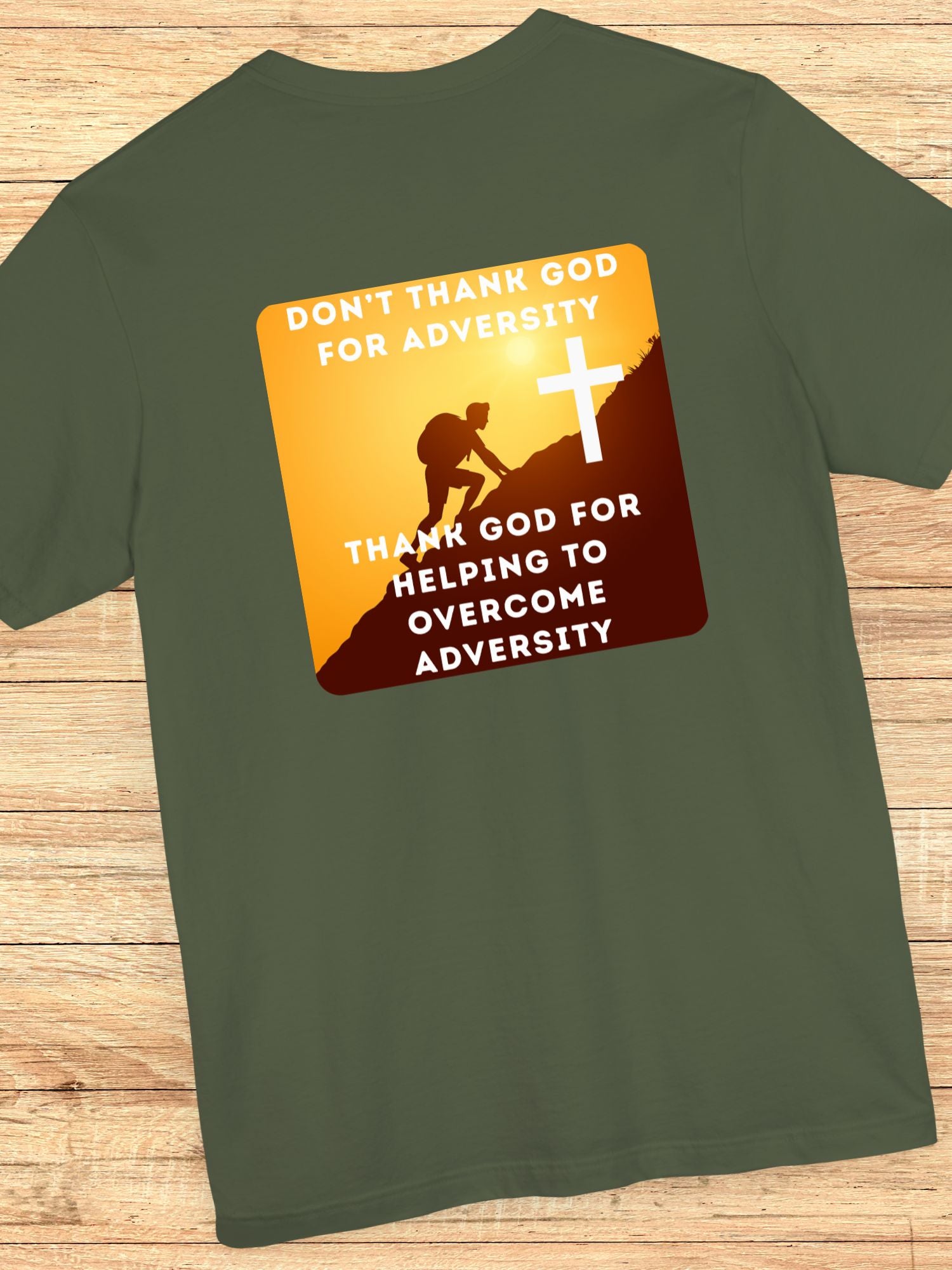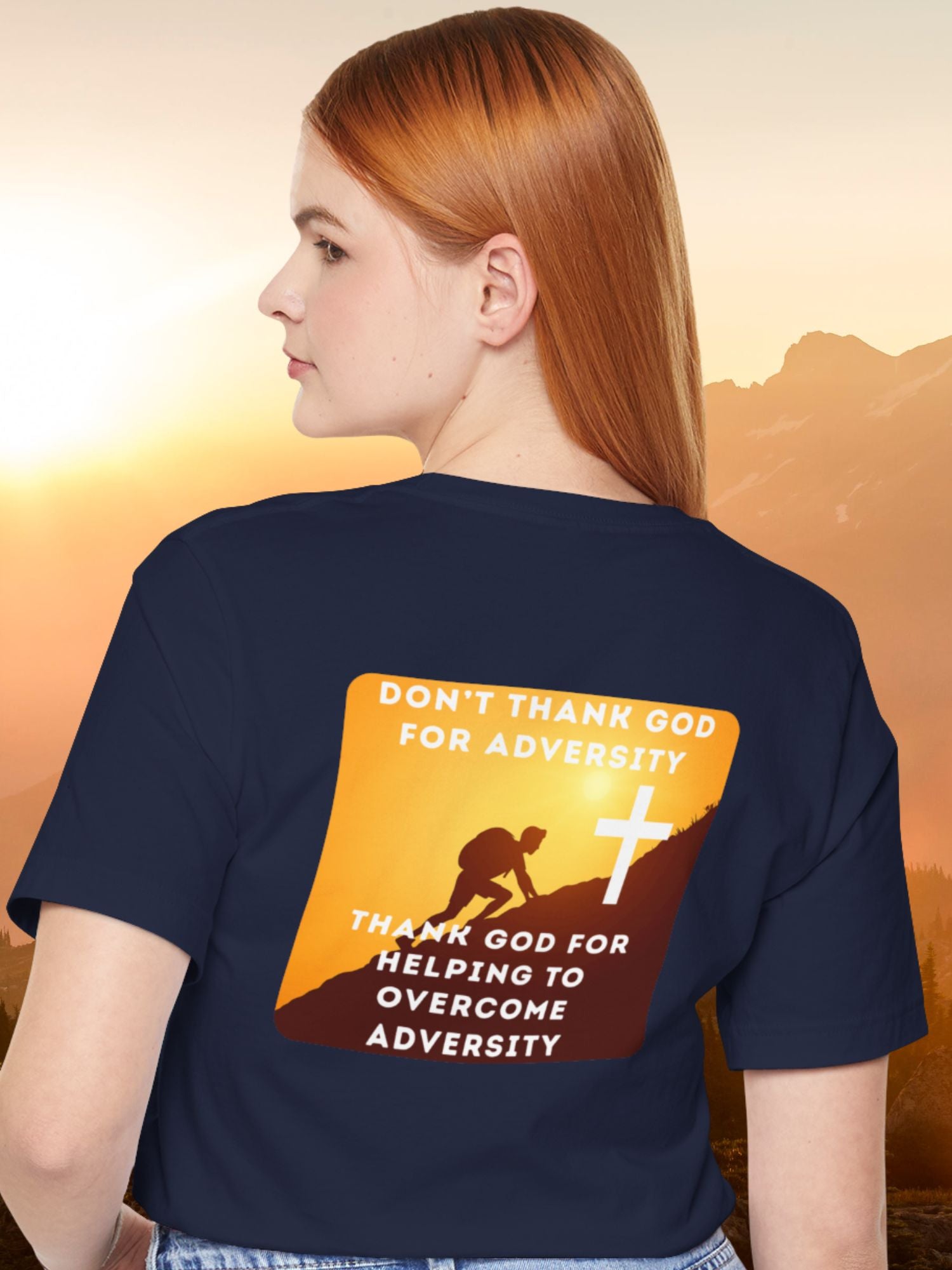 'Don't Thank God for Adversity, Thank God for Helping to Overcoming Adversity' Unisex T-Shirt. Printed on a quality Bella+Canvas 3001 T-Shirt.