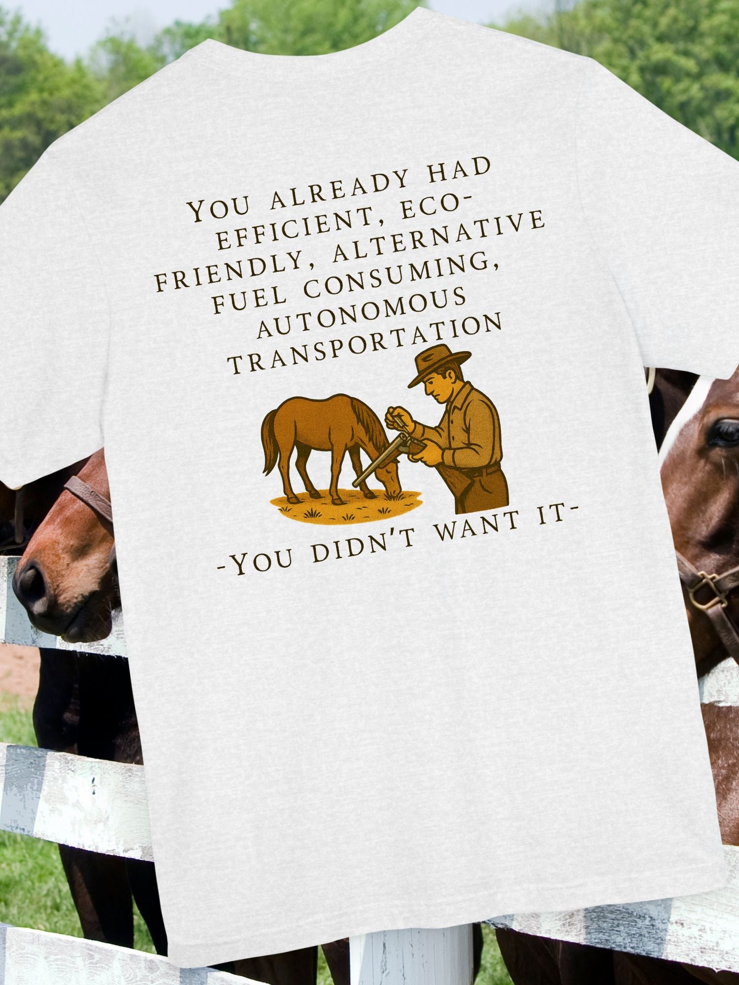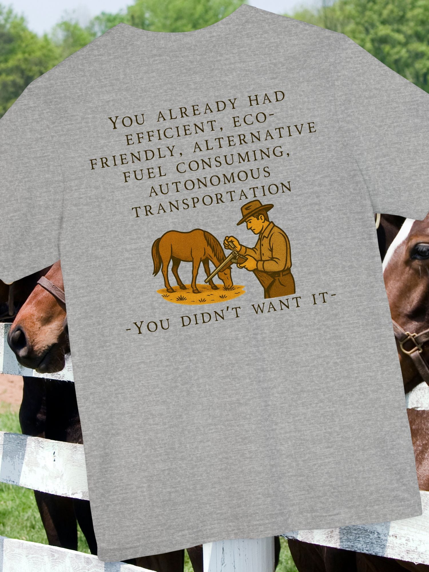 Eco-Friendly Humor Tee, Unisex Jersey Shirt, Gift for EV Lovers, Horse Lovers Apparel, Alternative Transportation