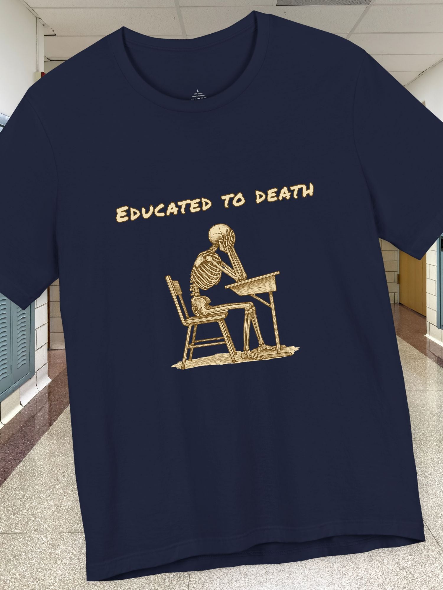 'Educated to Death' Graphic Unisex T-Shirt. Hate school? This shirt is for you. Printed on a quality Bella+Canvas 3001 T-Shirt.