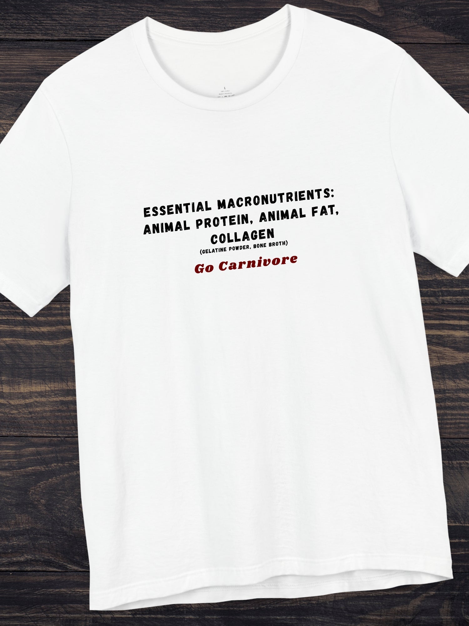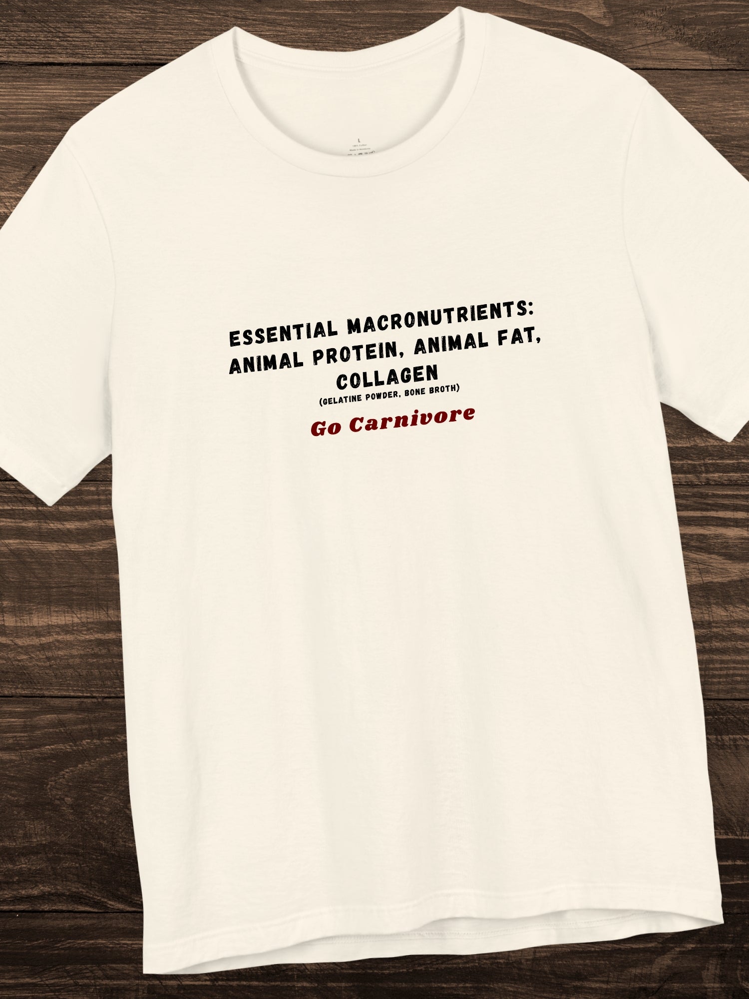 Essential Macronutrients: Animal Protein, Animal Fat, Collagen (gelatine powder, bone broth) Go Carnivore' Unisex T-Shirt. Printed on a quality Bella+Canvas 3001 T-Shirt.