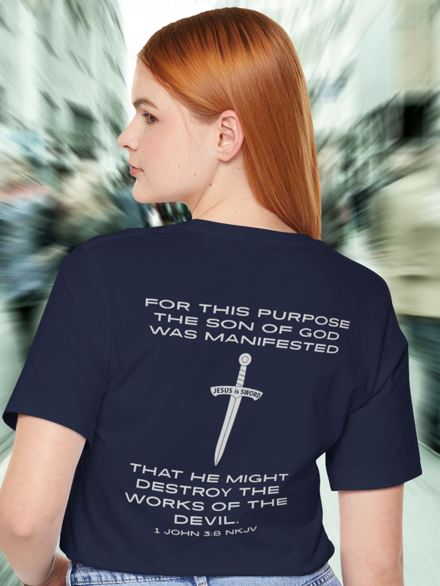 'For this purpose The Son of God was manifested that He might destroy the works of the devil, 1 John 3:8 NKJV, Jesus is Sword' Unisex T-Shirt. Printed on a quality Bella+Canvas 3001 T-Shirt.