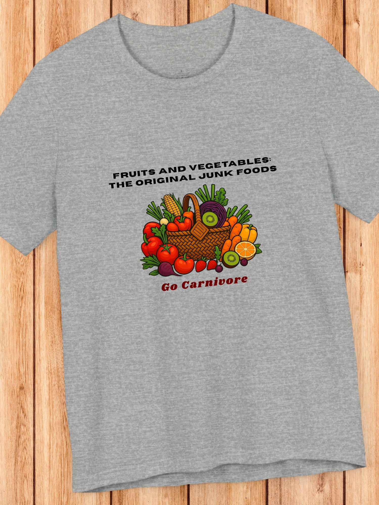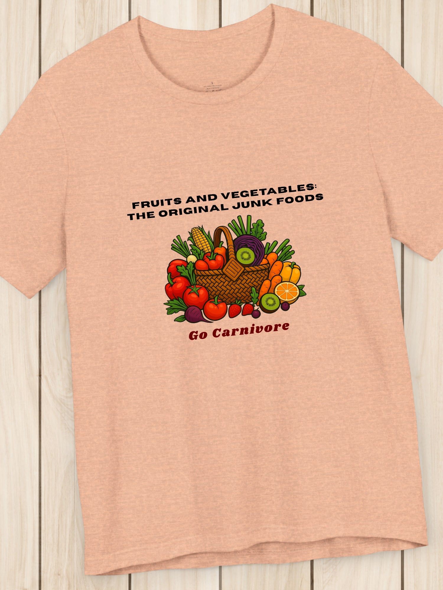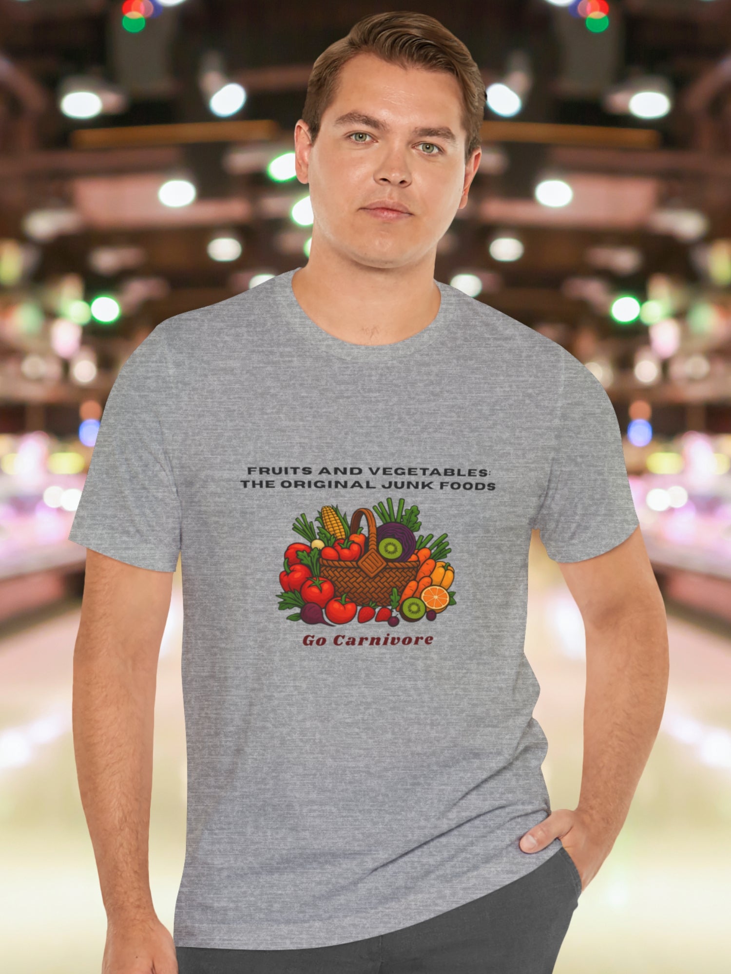 'Fruits and vegetables: The original junk foods, Go Carnivore' Fruit and Vegetable Basket Graphic Unisex T-Shirt, Carnivore Diet Apparel, Health and Wellness