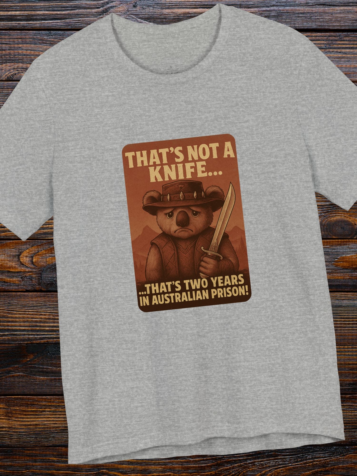 'That's Not a Knife... That's Two Years in Australian Prison' Sad Koala Graphic Unisex T-Shirt. "Humorously" remind the world what happens to countries that don't value personal freedom, self-defence or basic utility. You could say that Australia has gone back to the stone age... but if you picked up a stone in Australia you would probably get arrested. This is a good shirt for outdoor adventures, movie nights, casual outings, and hanging out with friends. This shirt also makes a good gift for outdoor enthusiasts. Don't be like Australia, second amend your ways! Printed on a quality Bella+Canvas 3001 T-shirt.