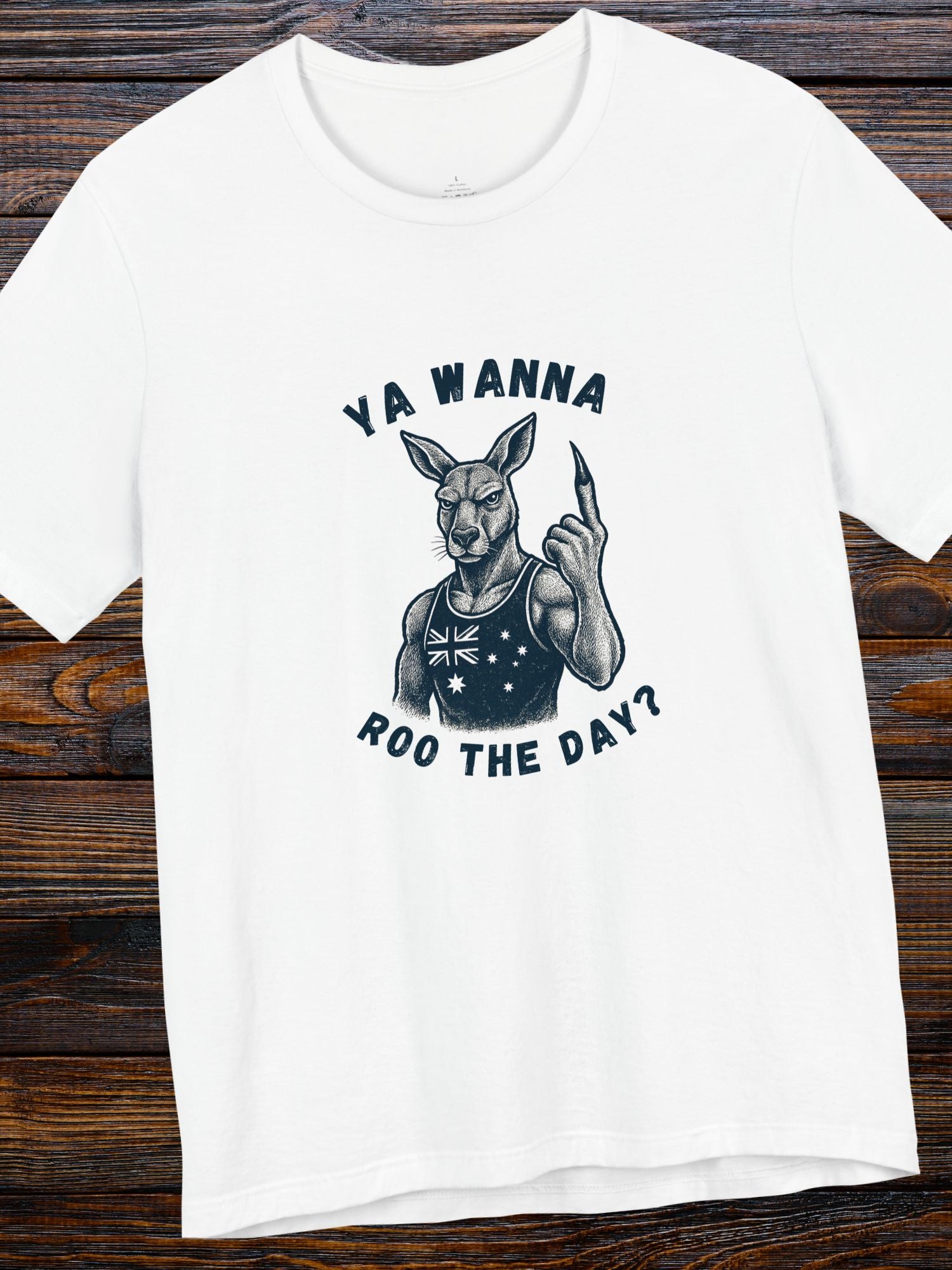 'Ya Wanna Roo the Day?' Tough Kangaroo Graphic Unisex T-Shirt. Printed on a quality Bella+Canvas 3001 T-shirt.