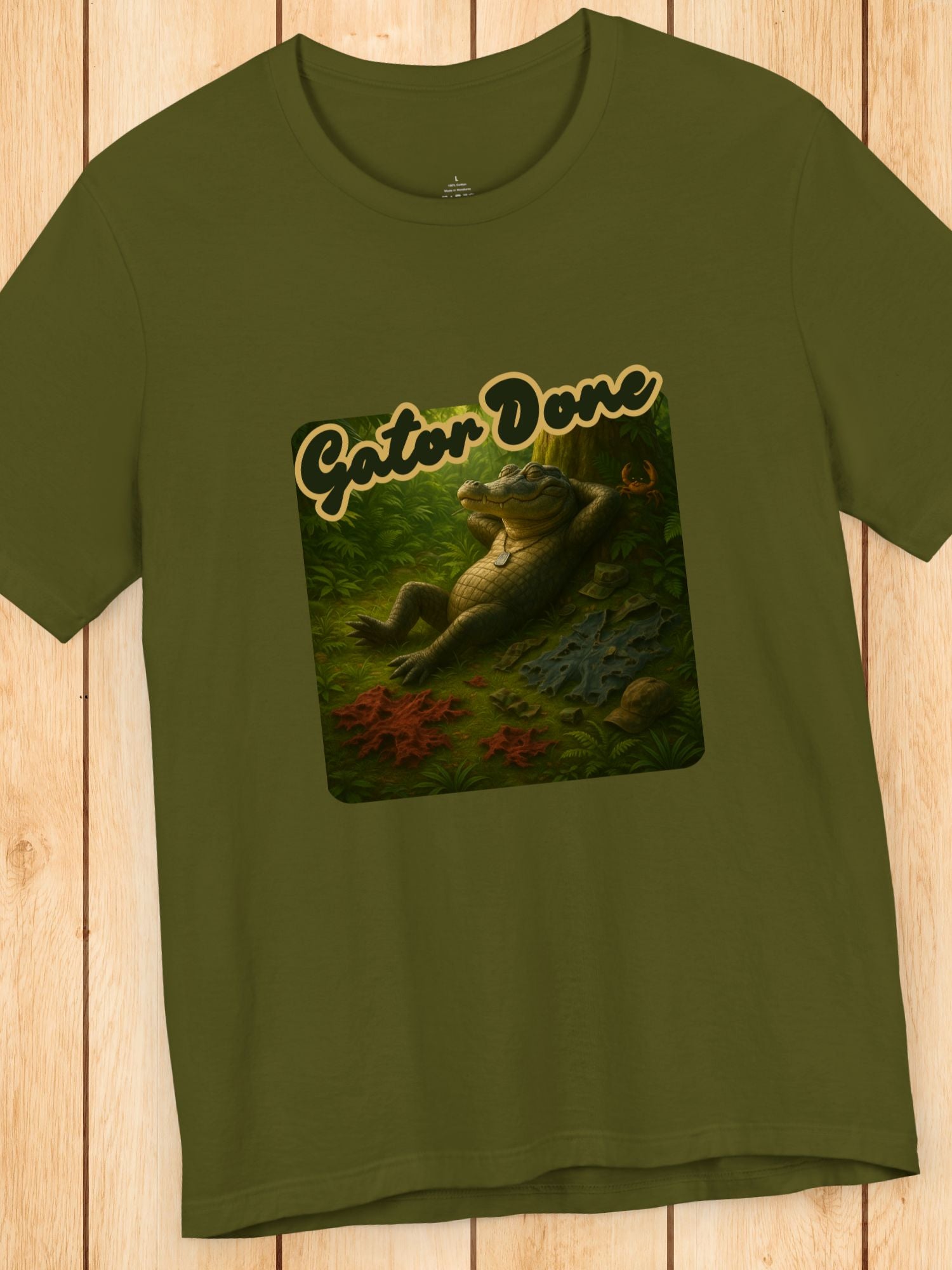 'Gator Done' Full Gator Relaxing Graphic Unisex T-Shirt. Printed on a quality Bella+Canvas 3001 T-Shirt.
