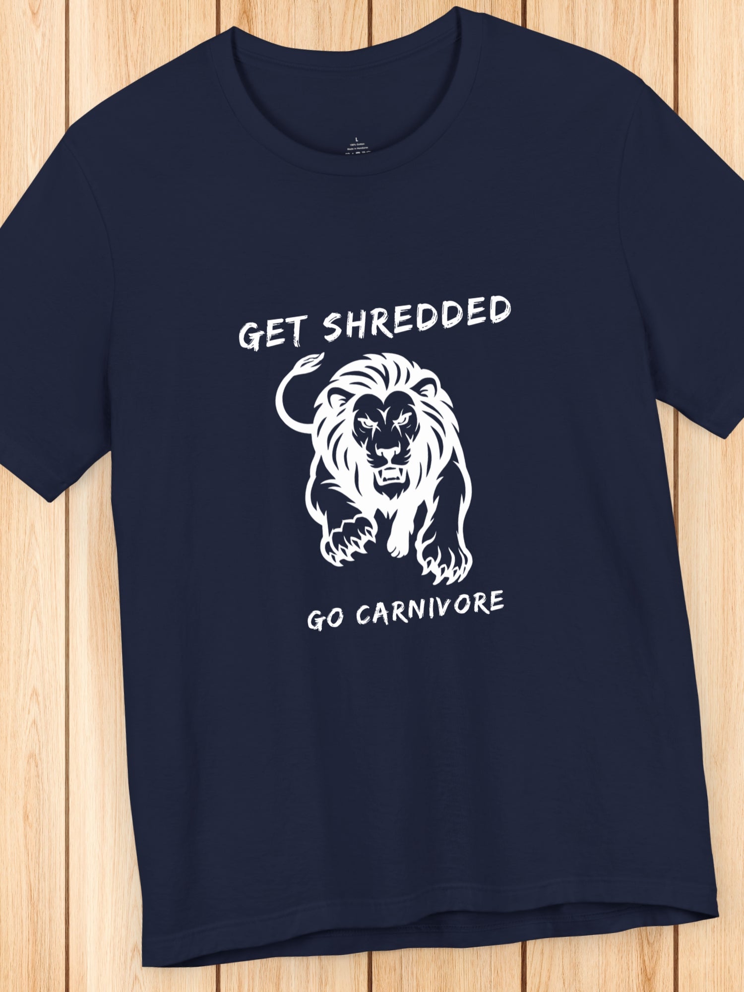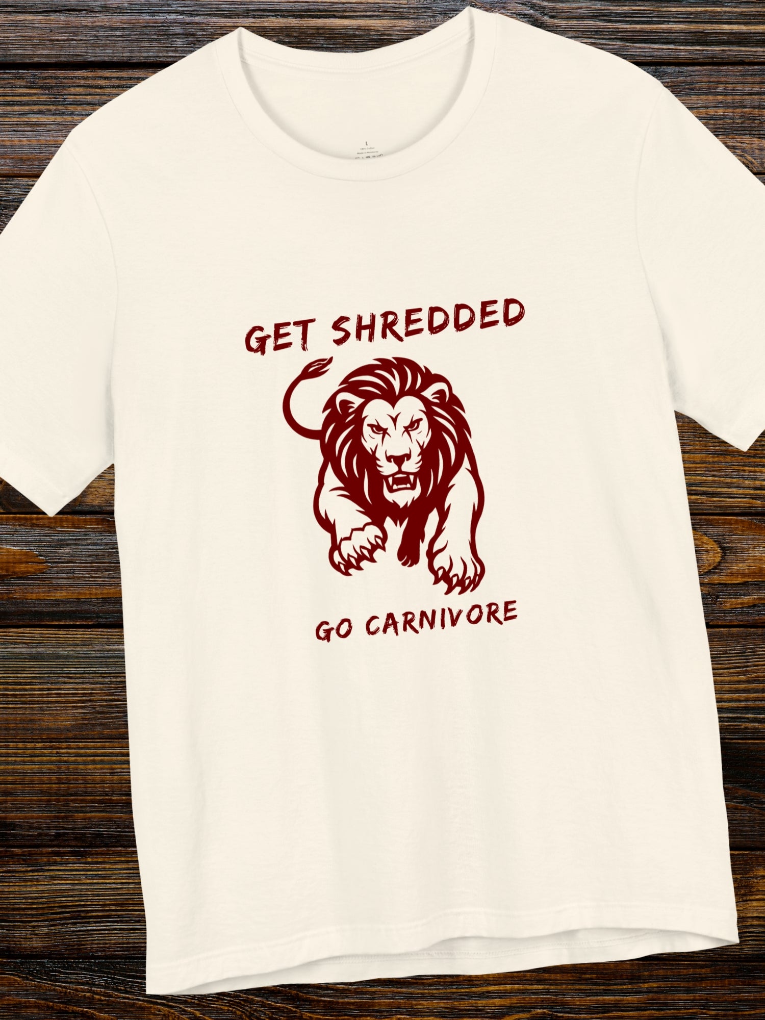 'Get Shredded, Go Carnivore' Lion Graphic Unisex T-Shirt. Printed on a quality Bella+Canvas 3001 T-Shirt.
