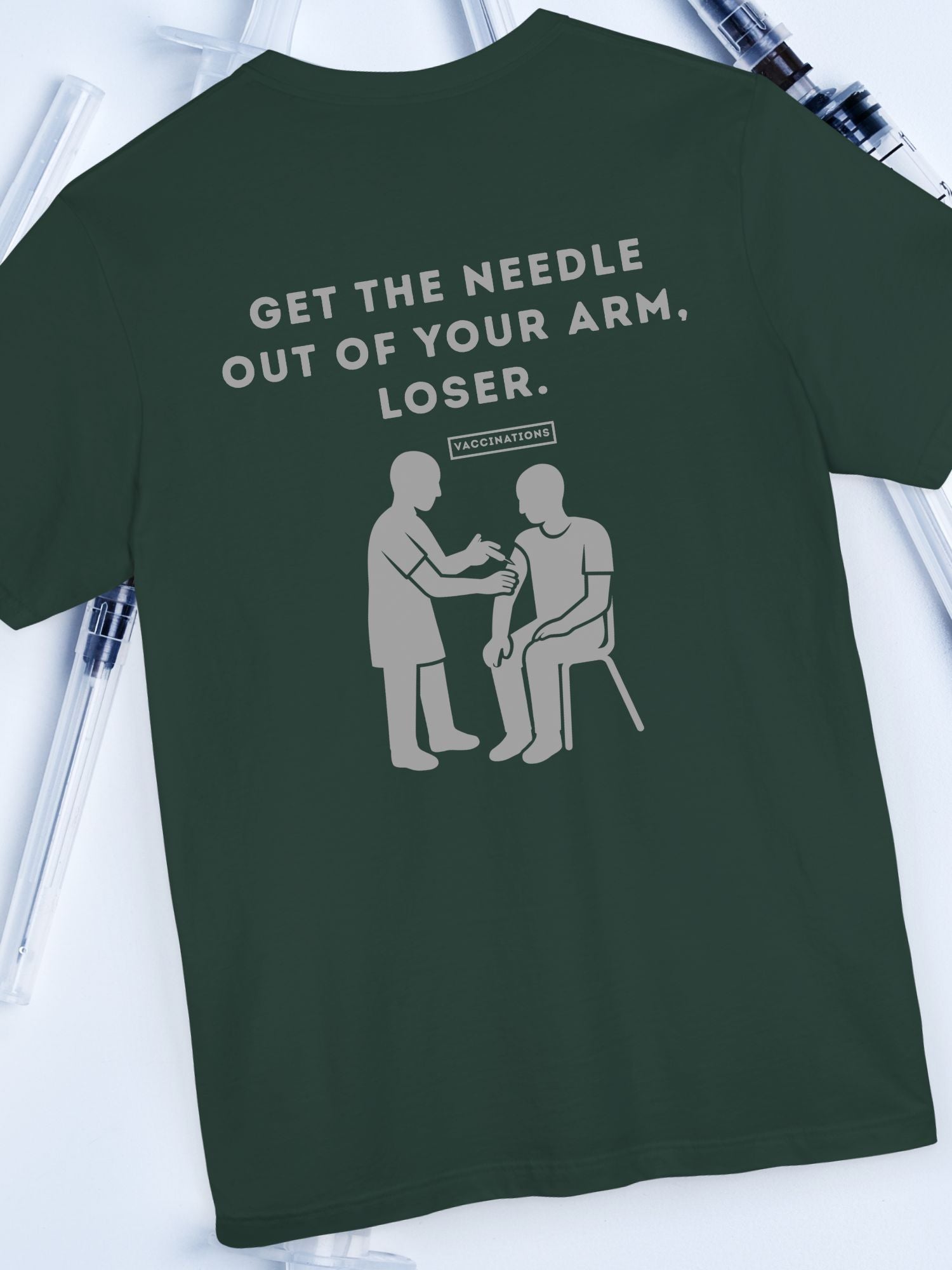 'Get the Needle Out of Your Arm, Loser' Anti-Vaccination Graphic Unisex T-Shirt. Printed on a quality Bella+Canvas 3001 T-Shirt.