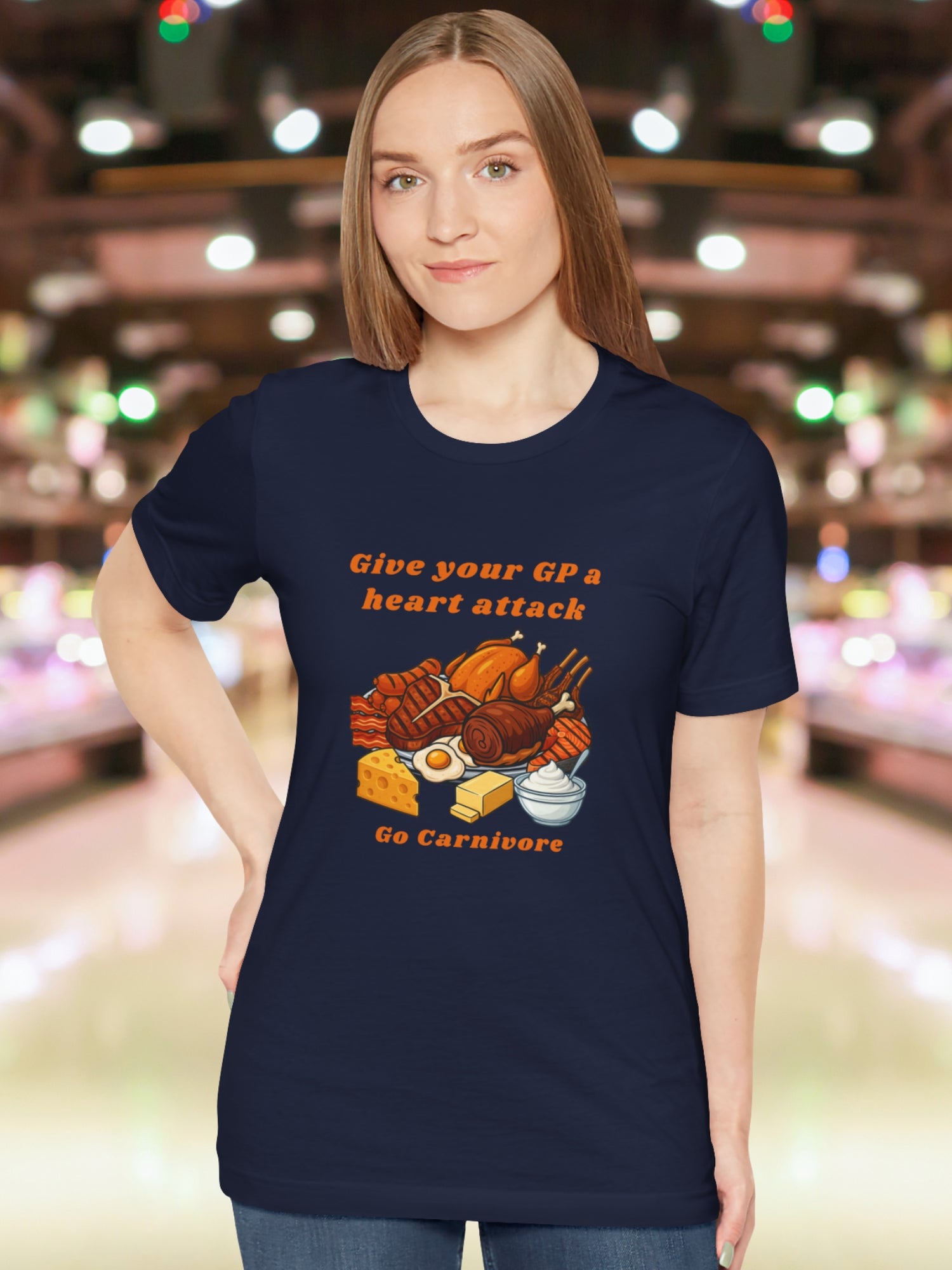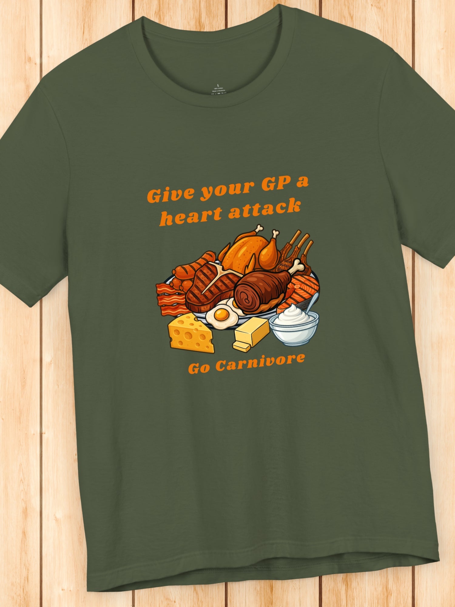 'Give your GP a heart attack, Go Carnivore' Carnivore Foods Graphic Unisex T-Shirt. Printed on a quality Bella+Canvas 3001 T-Shirt.