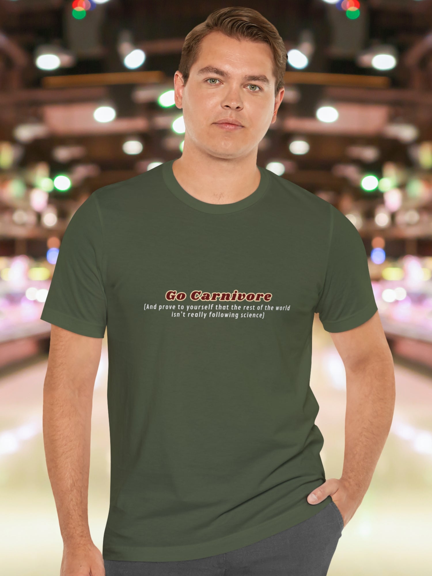 'Go Carnivore (and prove to yourself that the world isn't really following science)' Unisex T-Shirt. Printed on a quality Bella+Canvas 3001 T-Shirt.