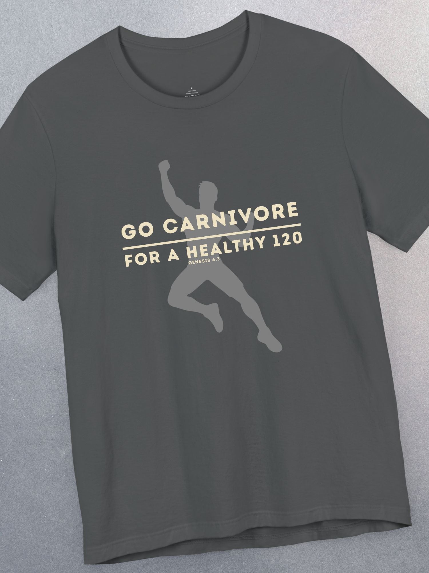 'Go Carnivore, For a Healthy 120, Genesis 6:3' Unisex T-Shirt (Men's Version). Printed on a quality Bella+Canvas 3001 T-Shirt.