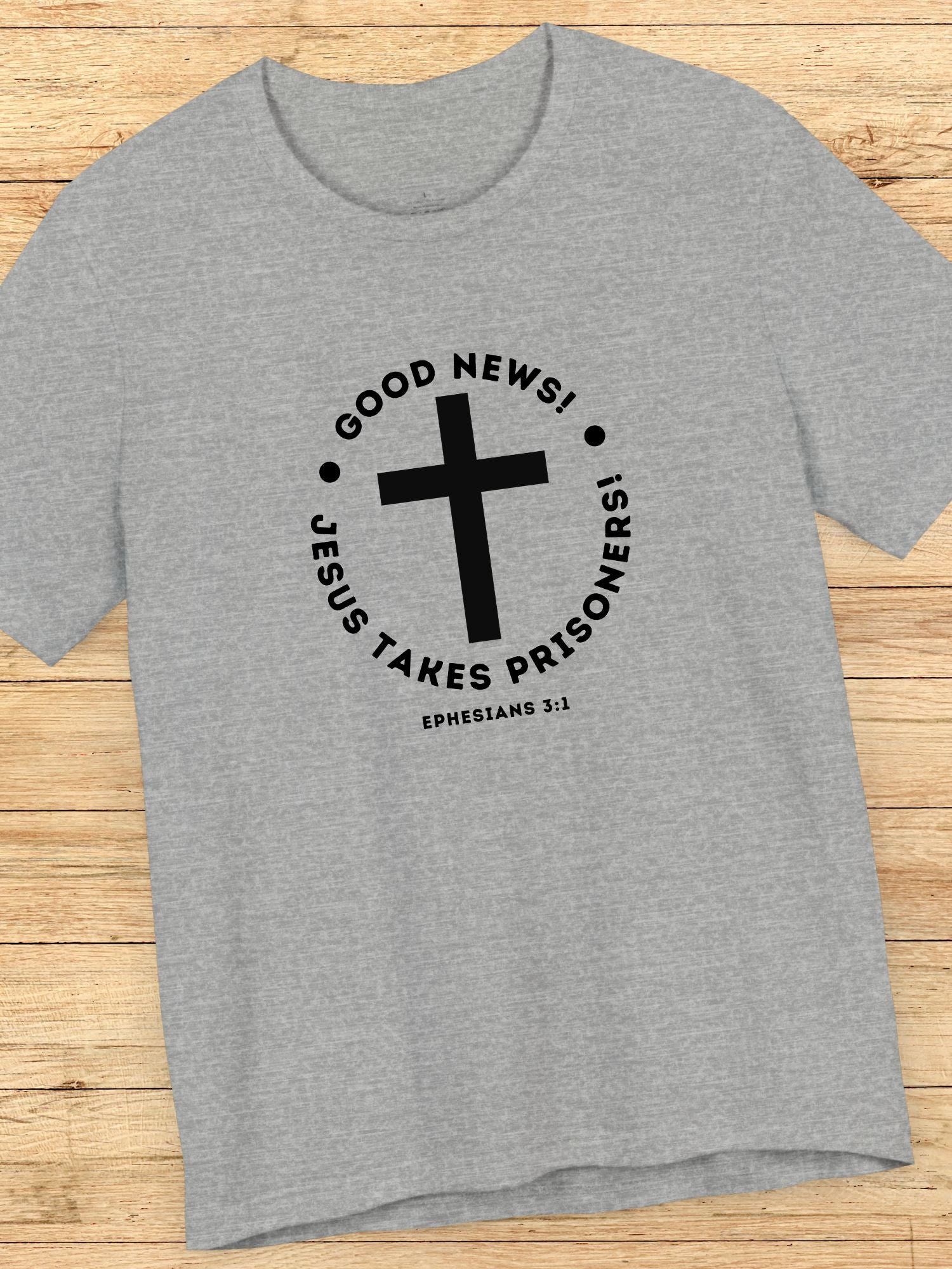 'Good News! Jesus Takes Prisoners! Ephesians 3:1' Cross Graphic Unisex T-Shirt. Printed on a quality Bella+Canvas 3001 T-Shirt.