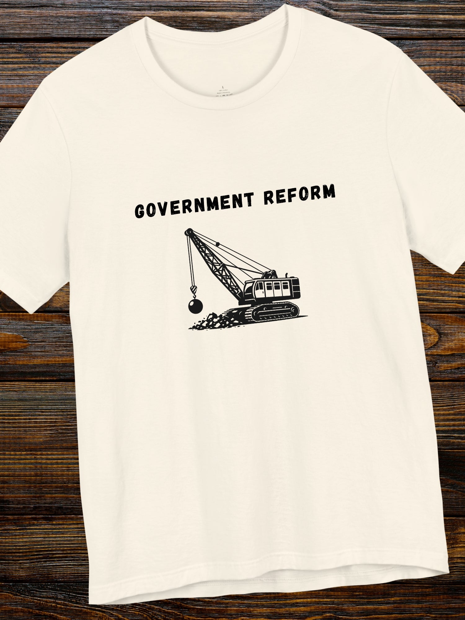 'Government Reform' Wrecking Ball Machine Graphic Unisex T-Shirt. Printed on a quality Bella+Canvas 3001 T-Shirt.