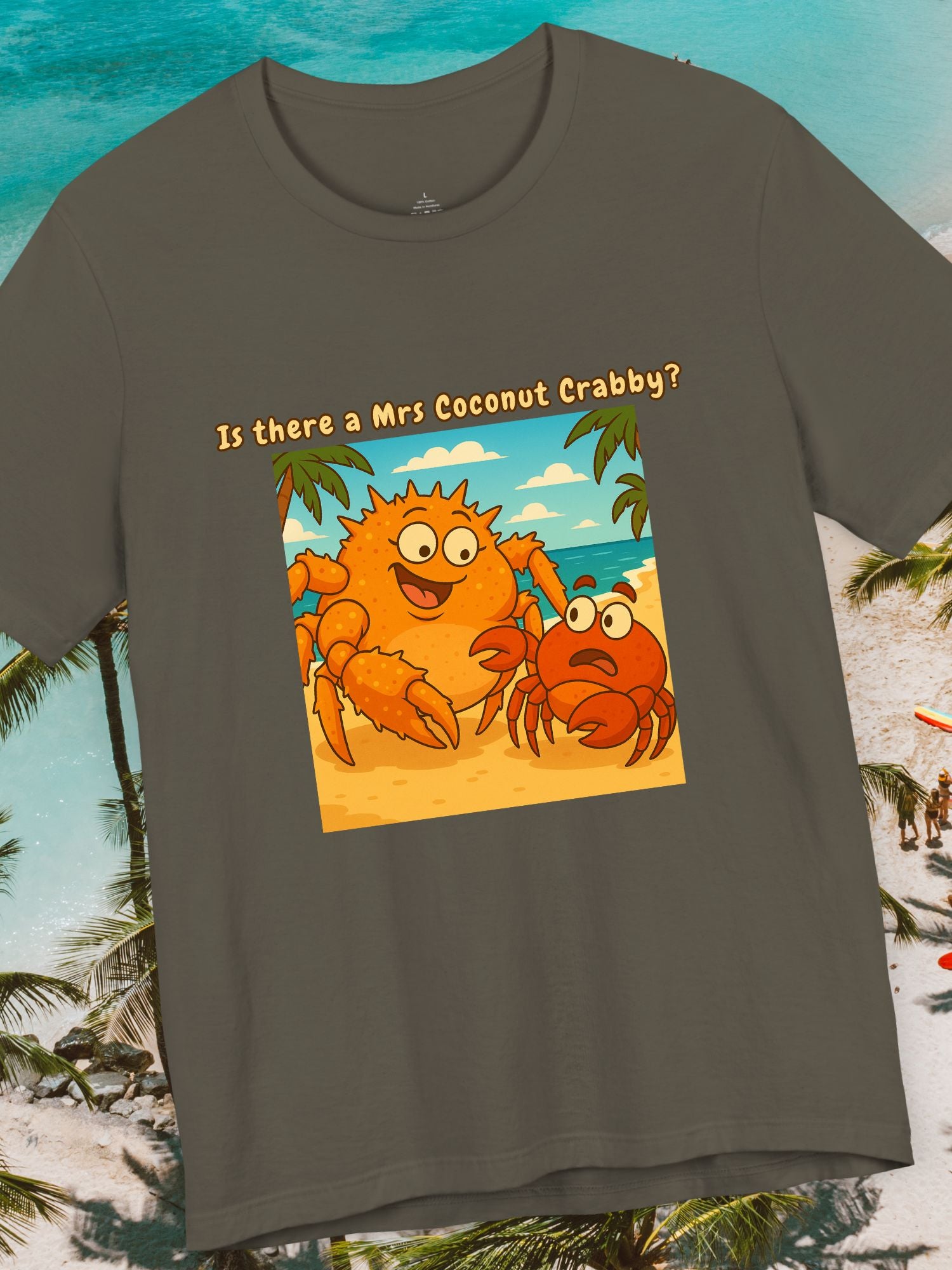 'Is There a Mrs Coconut Crabby?' Funny Crab Graphic Unisex T-Shirt, Beach Lover Gift, Tropical Vacation Shirt, Cute Cartoon T-Shirt, Summer Apparel