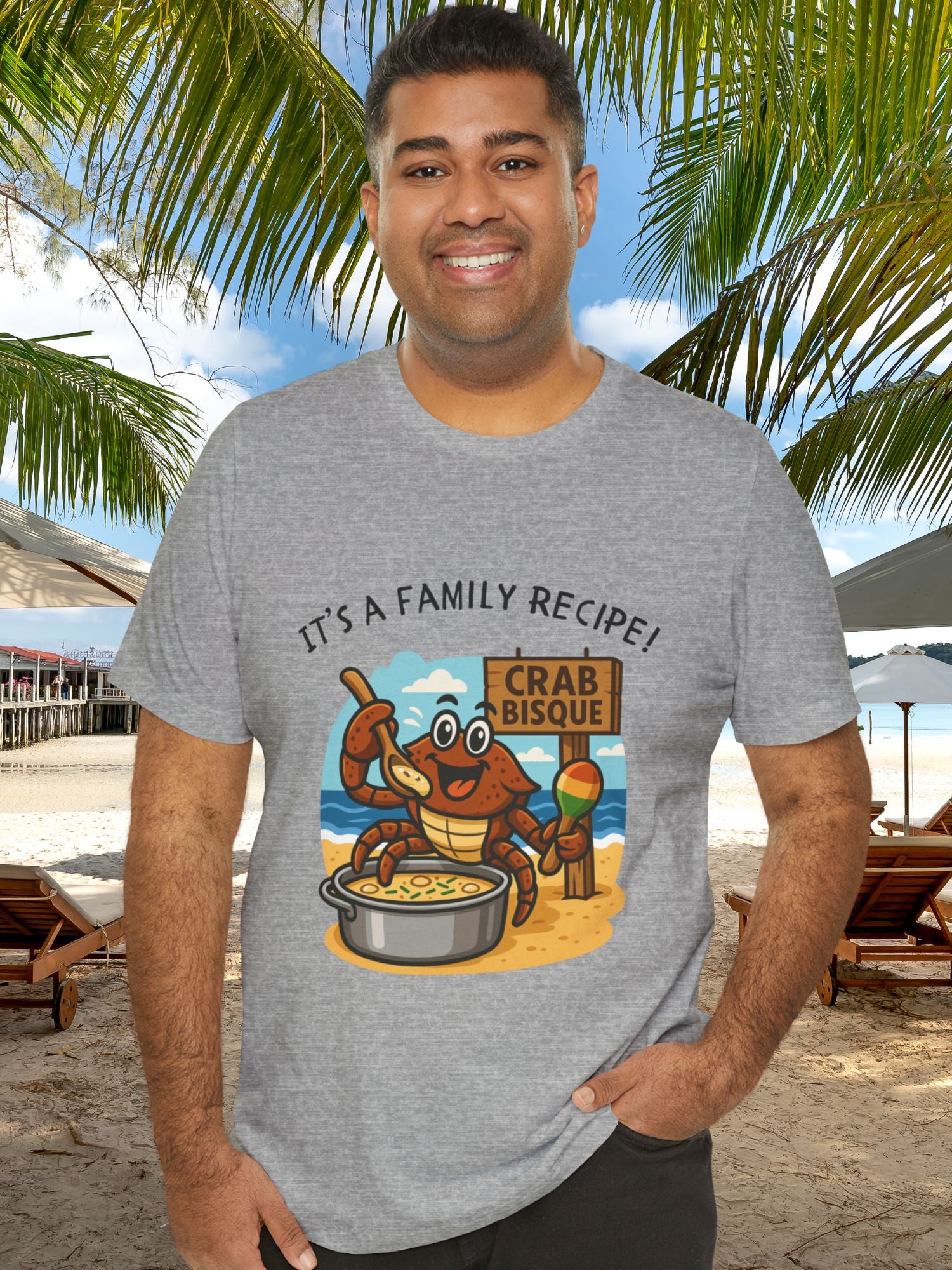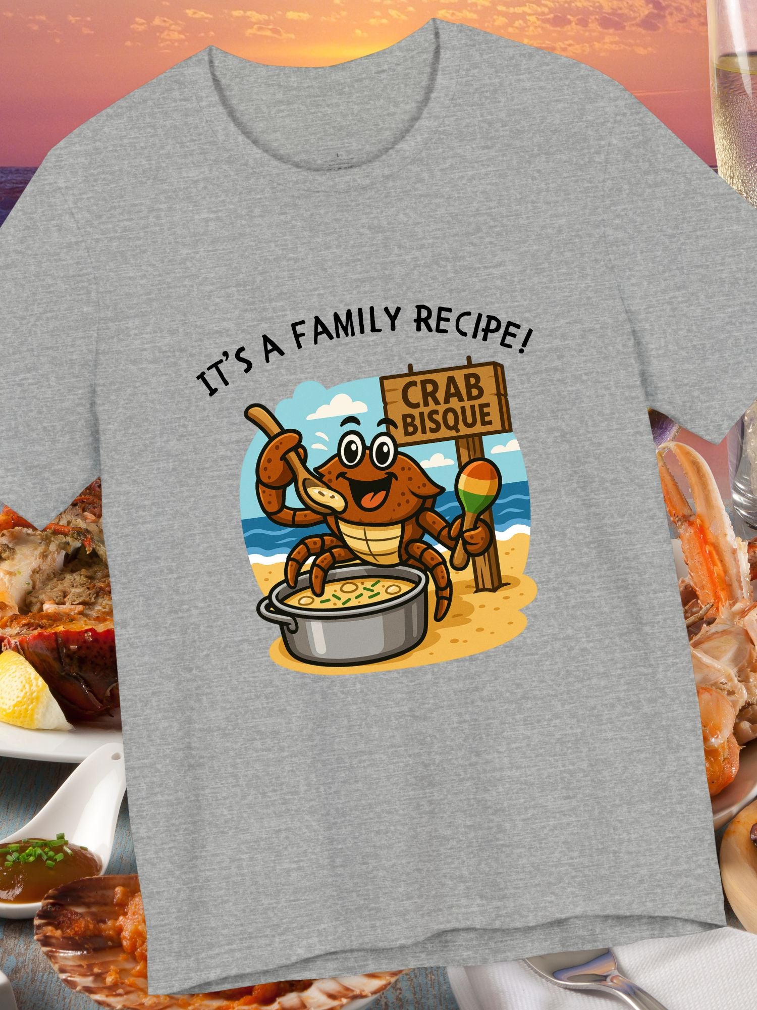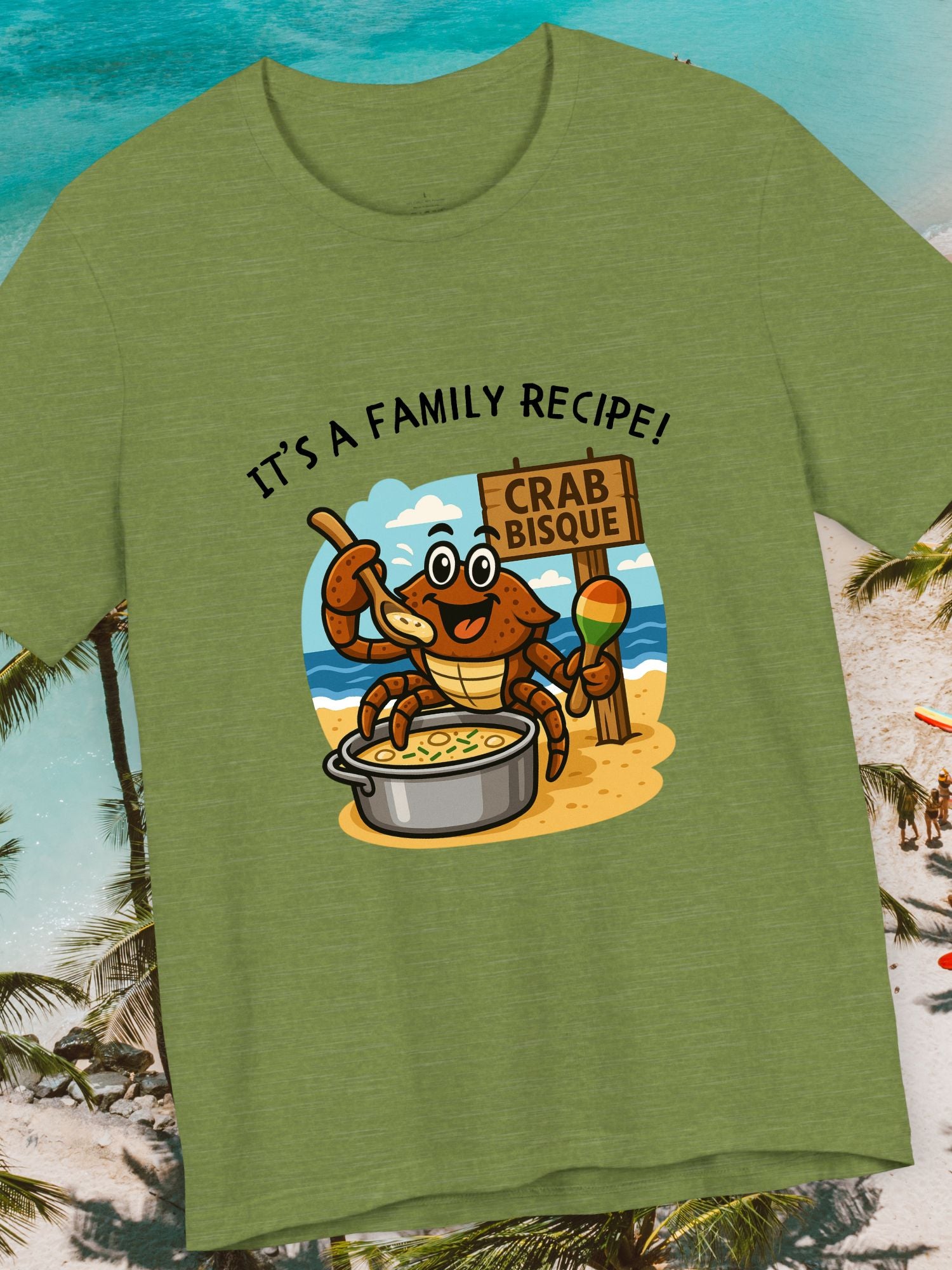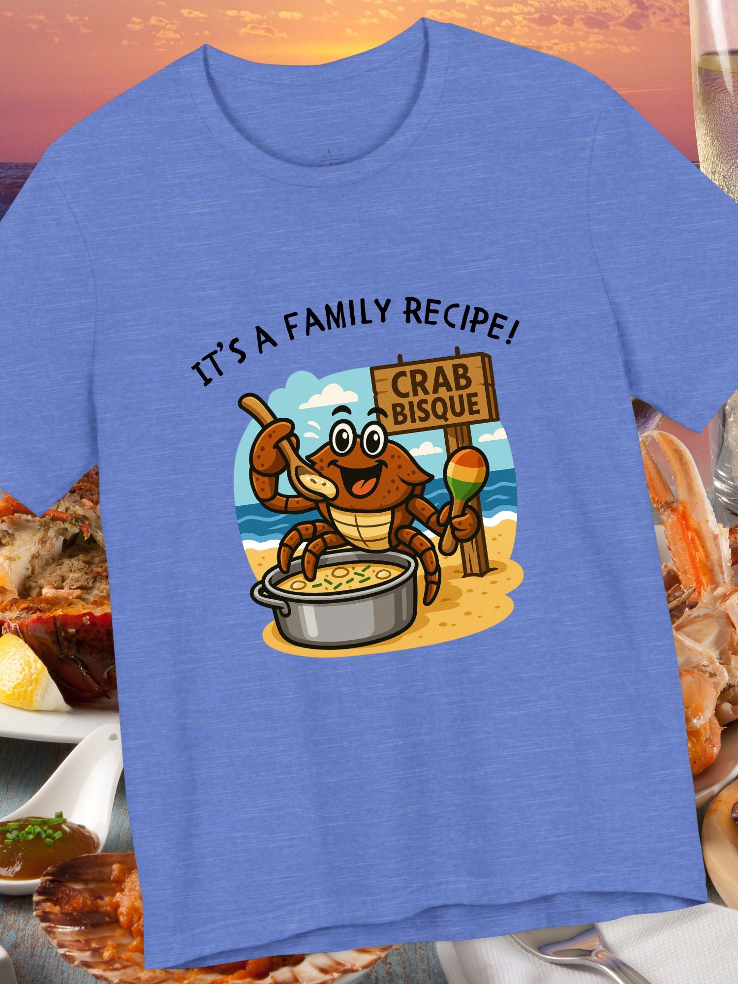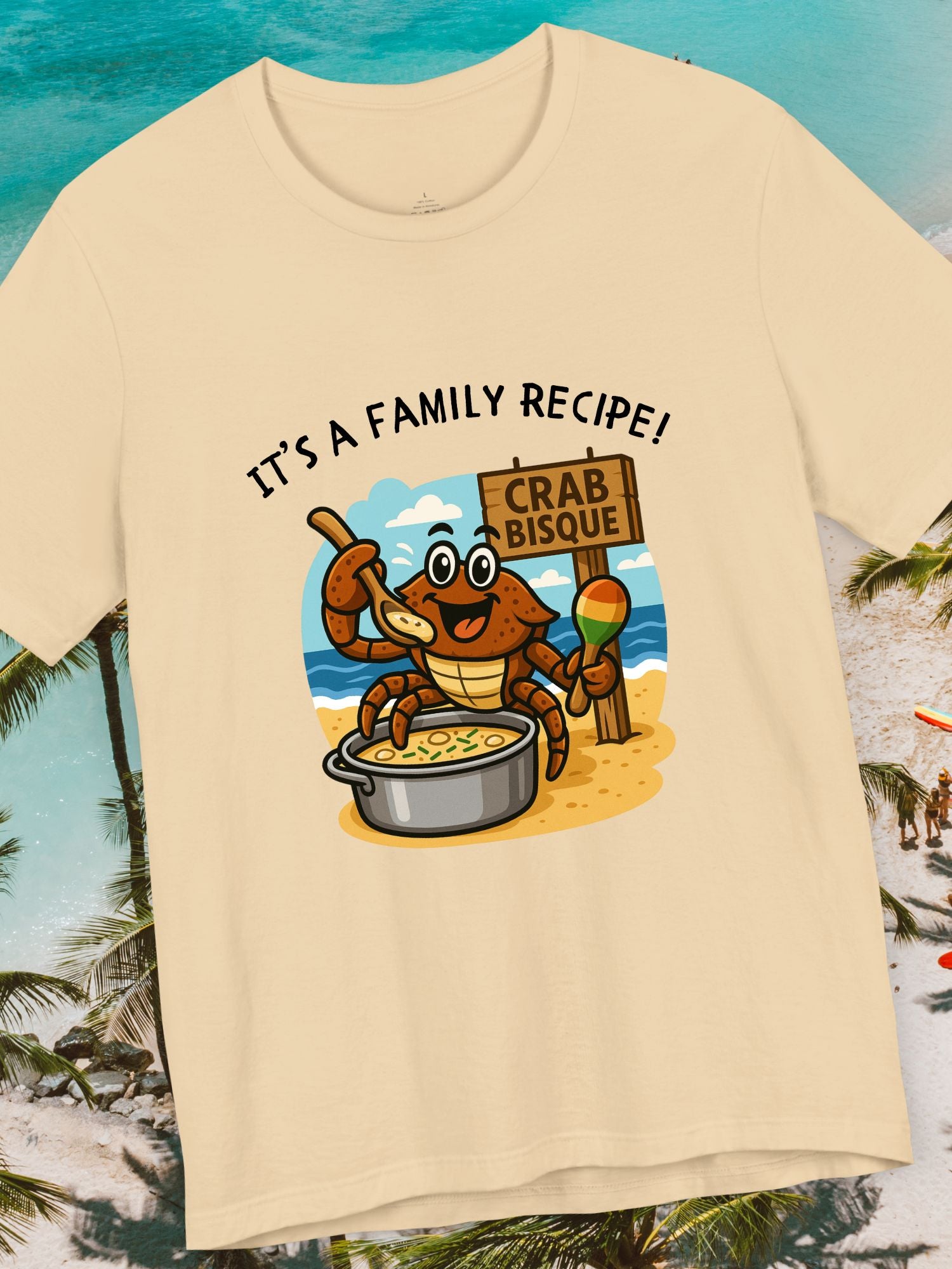 'It's a Family Recipe!' Coconut Crabby Twisted Crab Bisque Graphic Unisex T-Shirt. Coconut Crabby, Seafood and beach apparel. Printed on a quality Bella+Canvas 3001 T-Shirt.