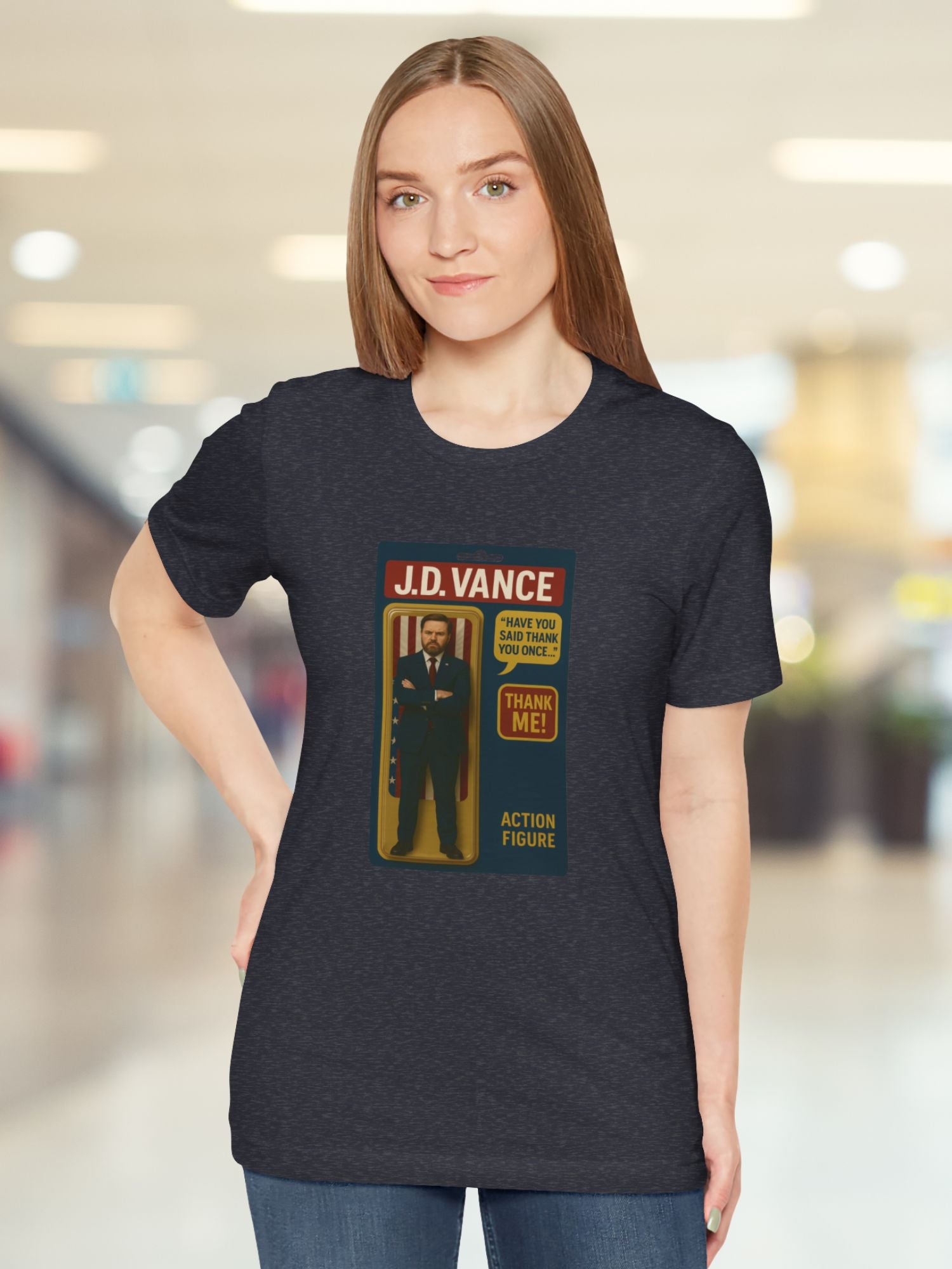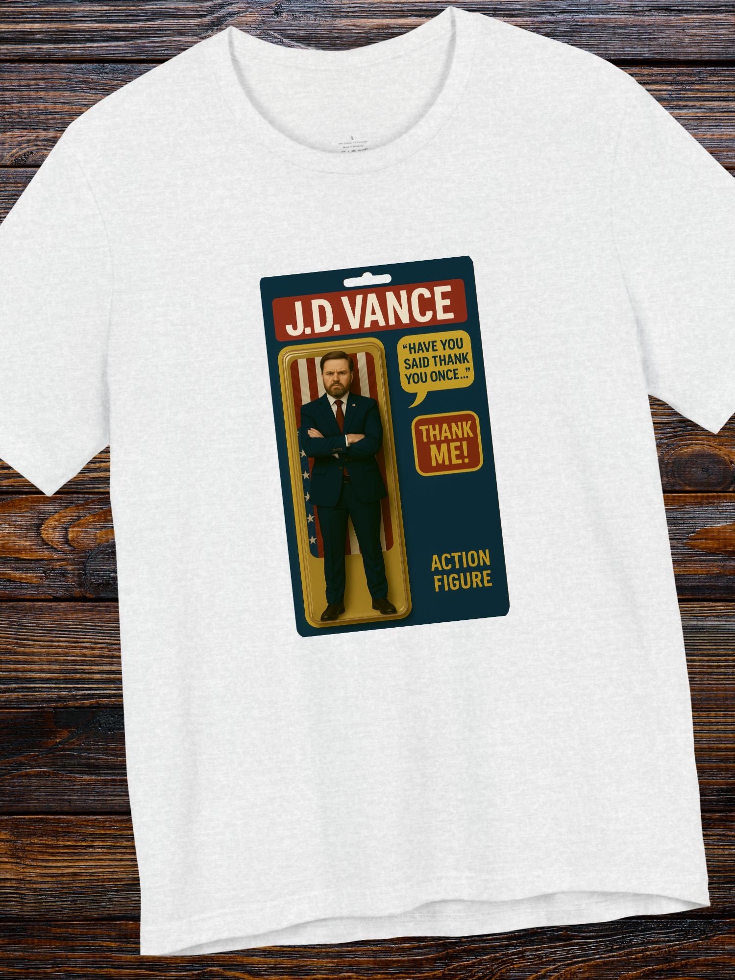'J.D. Vance Action Figure, Thank Me!' Graphic Unisex T-Shirt. Printed on a quality Bella+Canvas 3001 T-Shirt.