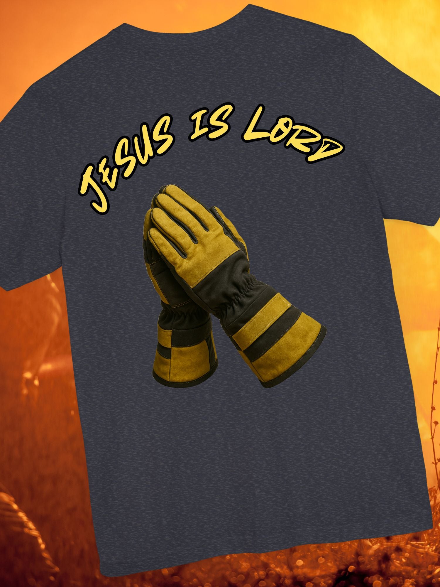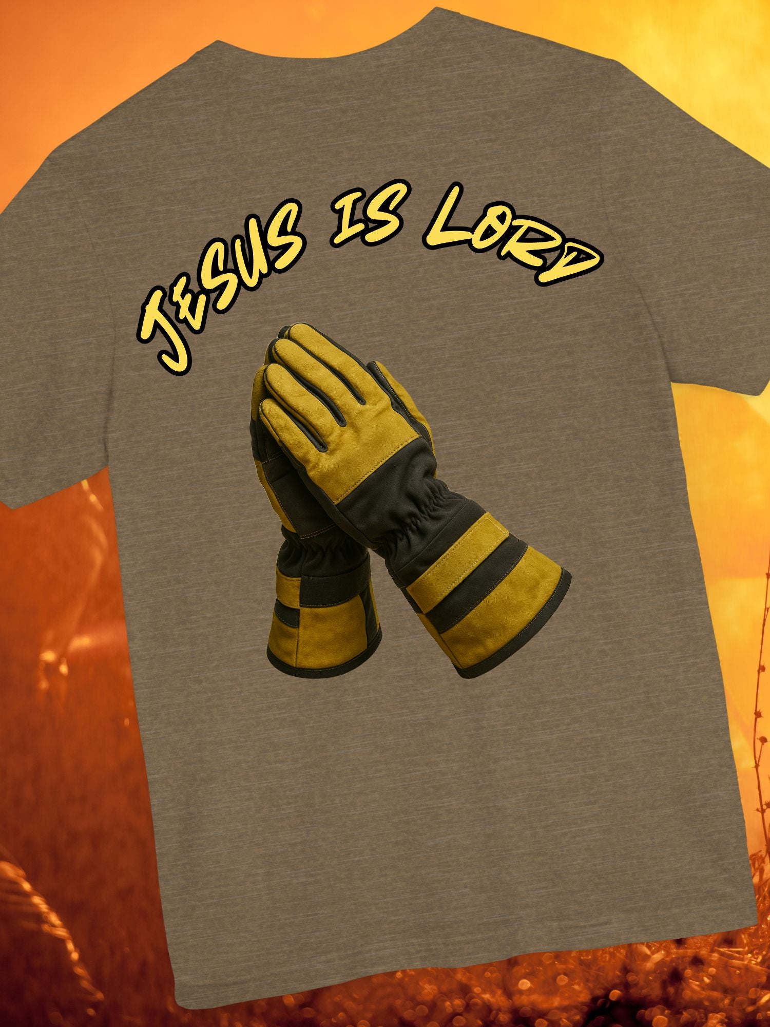 Unisex cotton t-shirt designed for Christian firefighters or a gift for a Christian firefighter.  The shirt says "Jesus is Lord" and features firefighter gloves in a prayer hands position. Printed on a quality Bella+Canvas 3001 T-shirt.