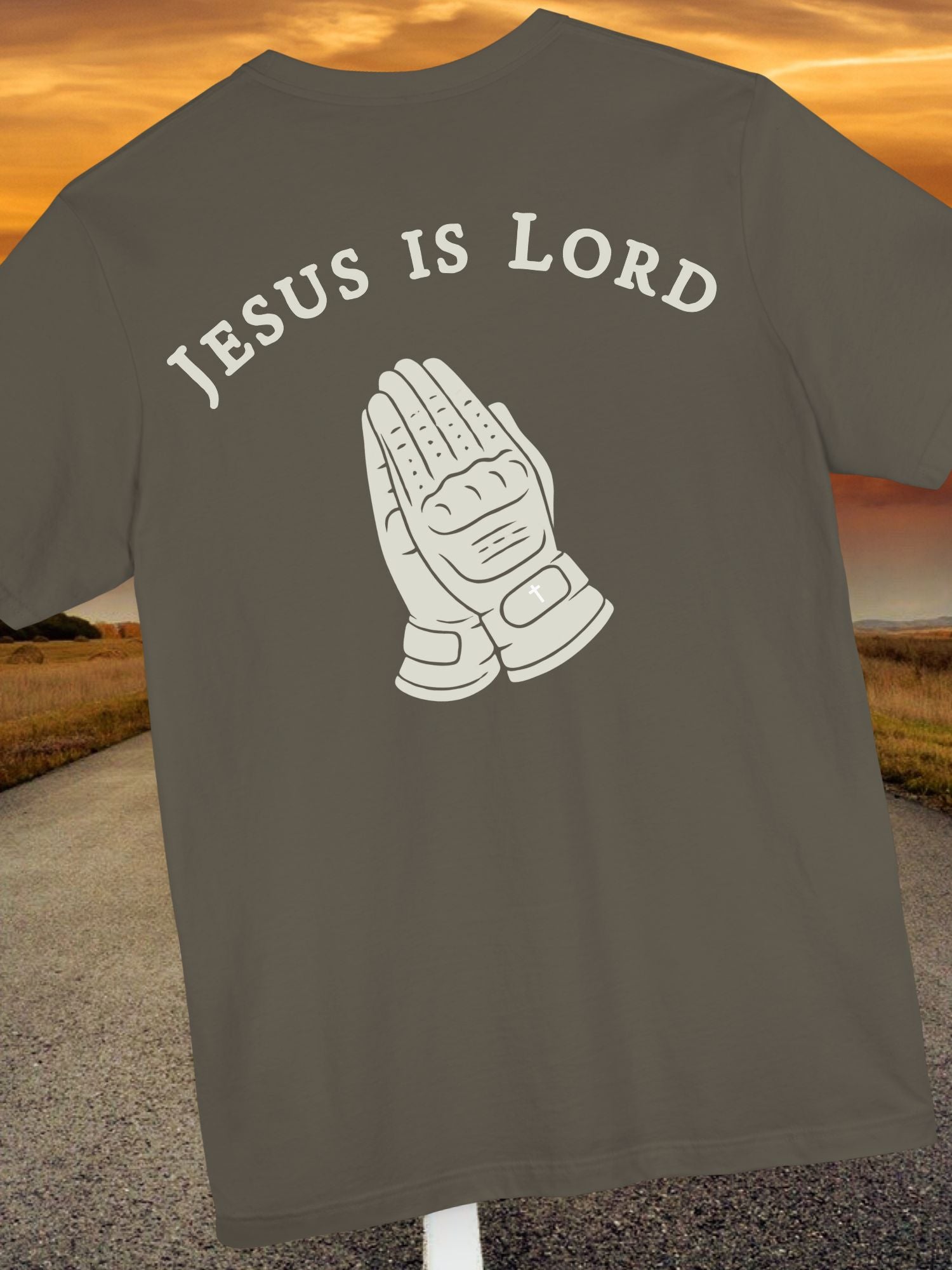"Jesus is Lord" Motorcycle Gloves Praying Hands Unisex Short Sleeve Tee, Christian T-Shirt