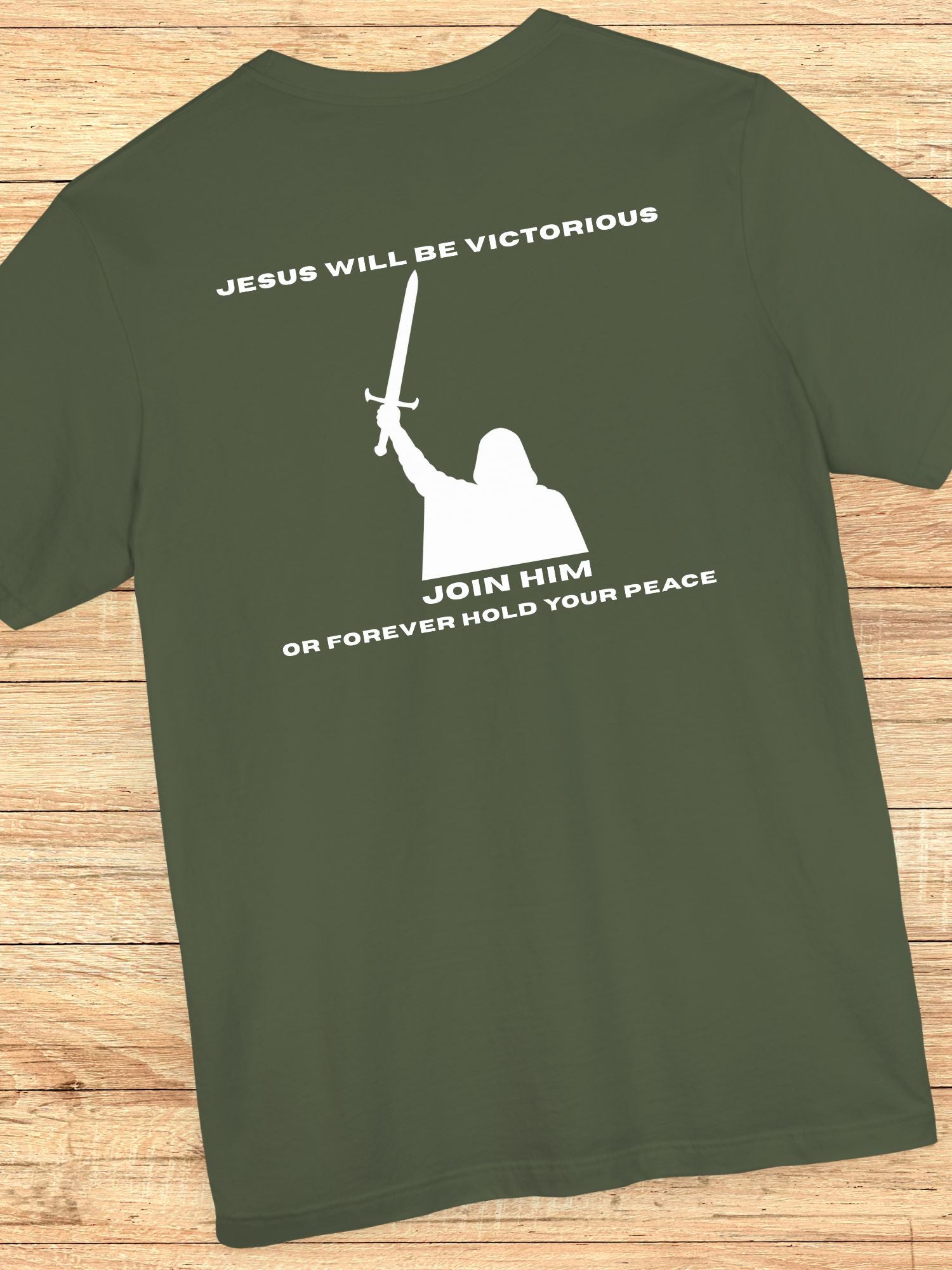 'Jesus Will be Victorious, Join Him, Or Forever Hold Your Peace' Victory Graphic Unisex T-Shirt. Printed on a quality Bella+Canvas 3001 T-Shirt.