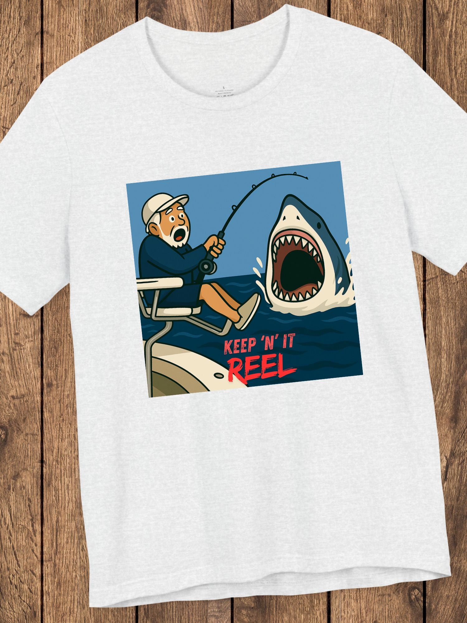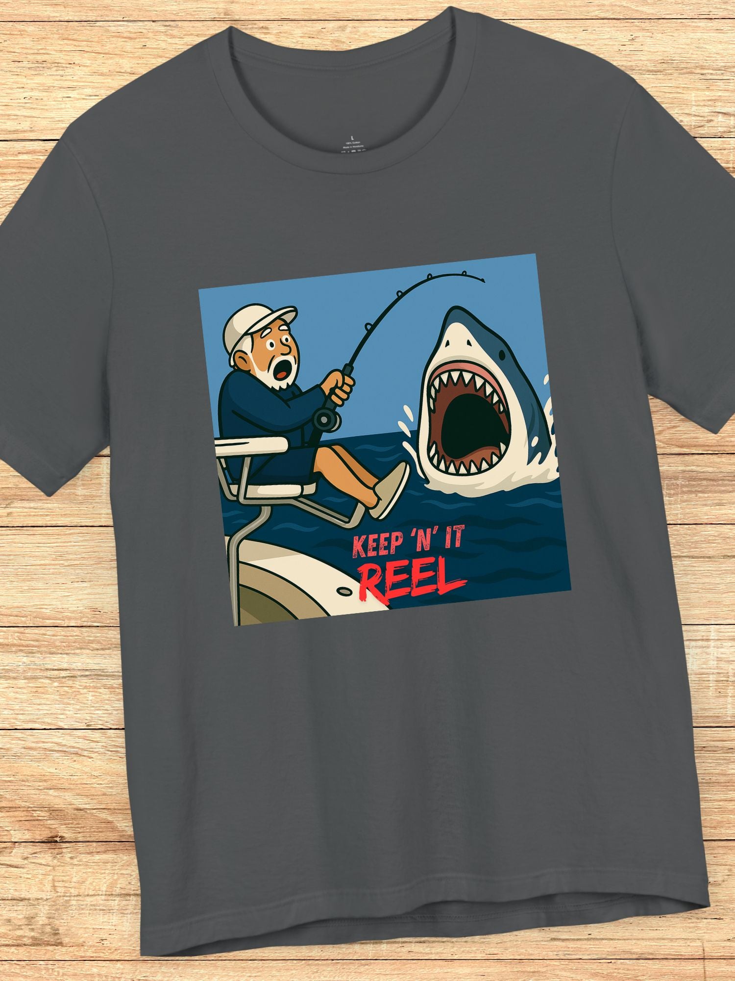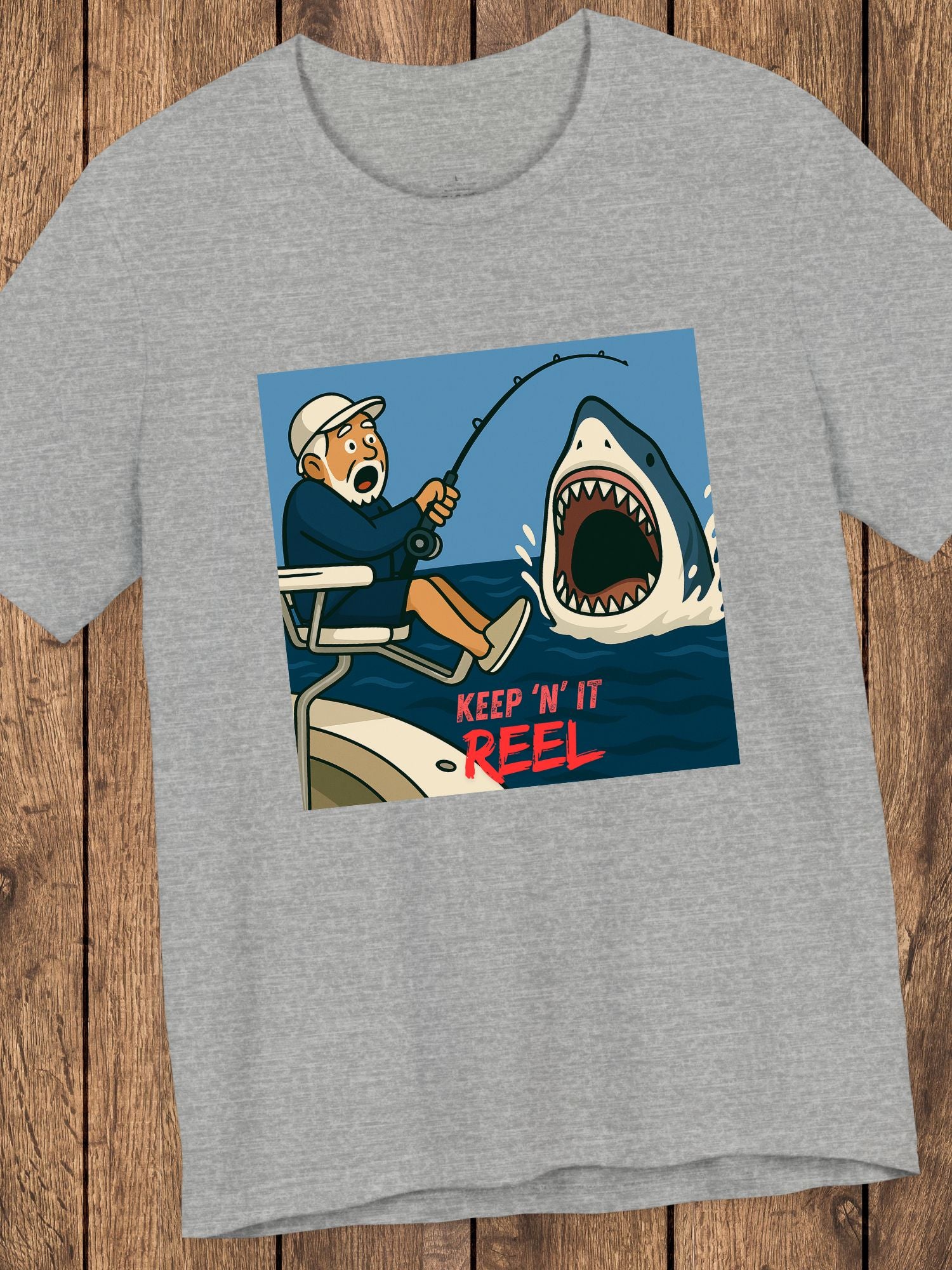 'Keep ‘N’ It Reel' Shark Fisherman Graphic Unisex T-Shirt, Fishing Apparel