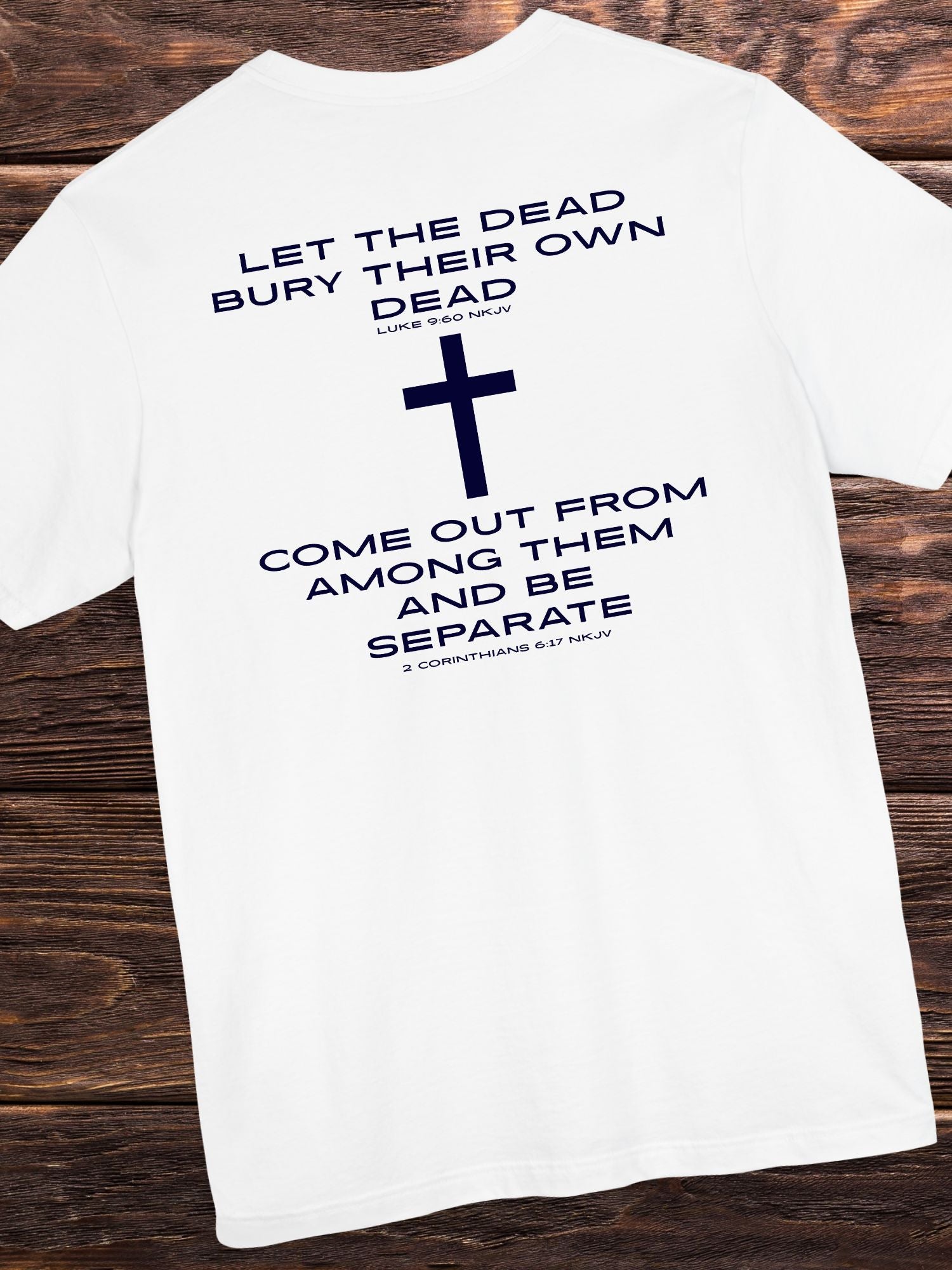 'Let the dead bury their own dead, Come out from among them and be separate' Unisex T-Shirt. Bible verses Luke 9:60, 2 Corinthians 6:17 NKJV Printed on a quality Bella+Canvas 3001 T-Shirt.