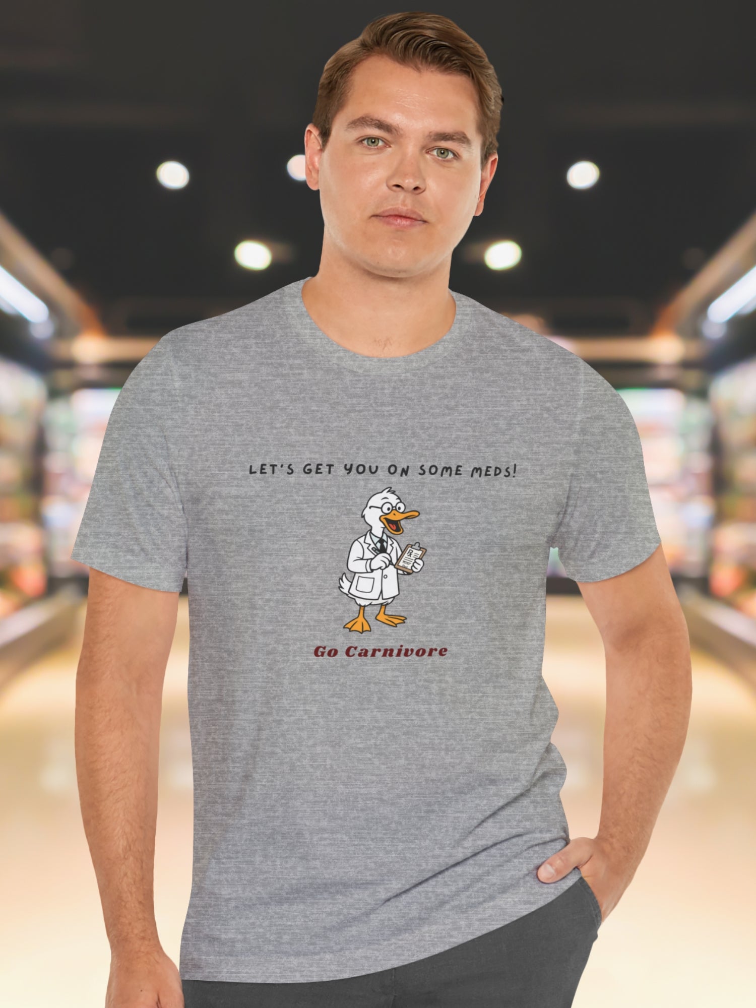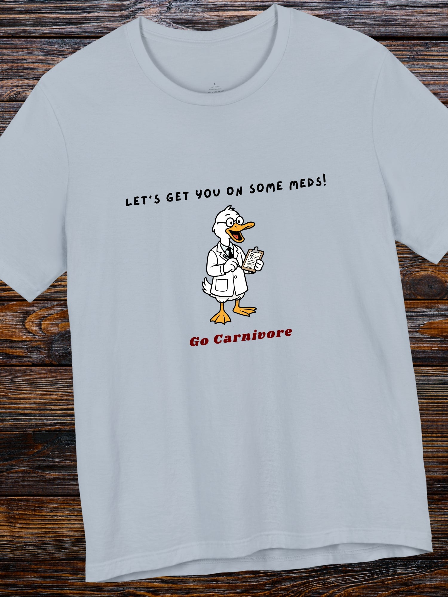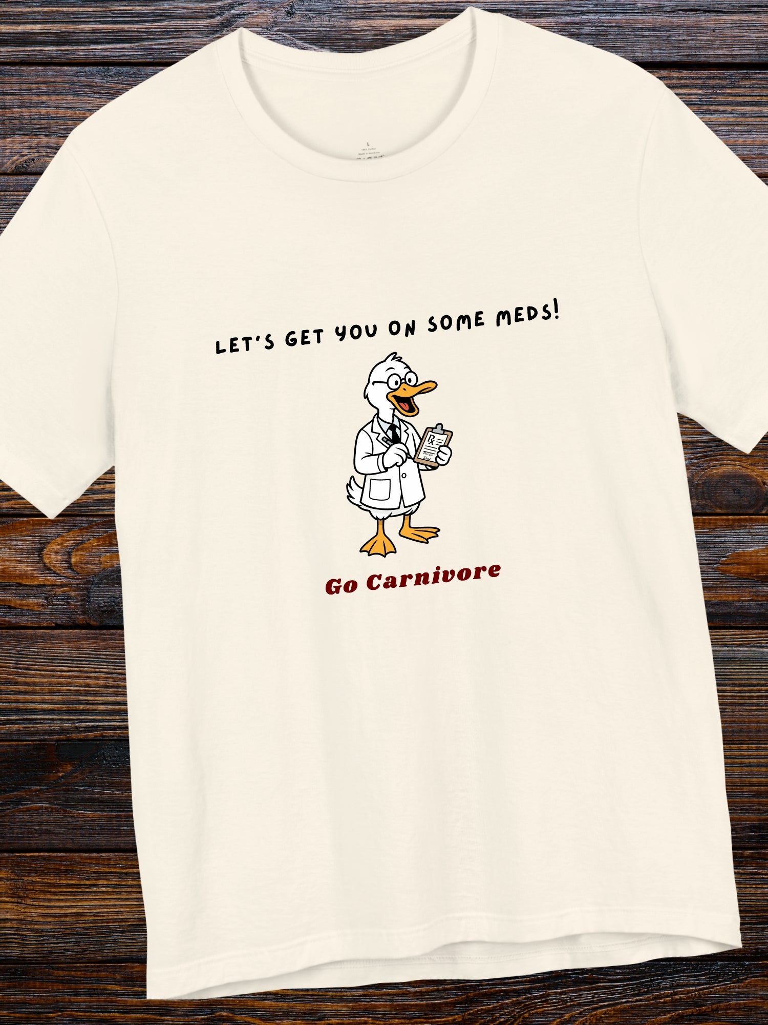 'Let's get you on some meds!, Go Carnivore' Duck Doctor Graphic Unisex T-Shirt. Printed on a quality Bella+Canvas 3001 T-Shirt.