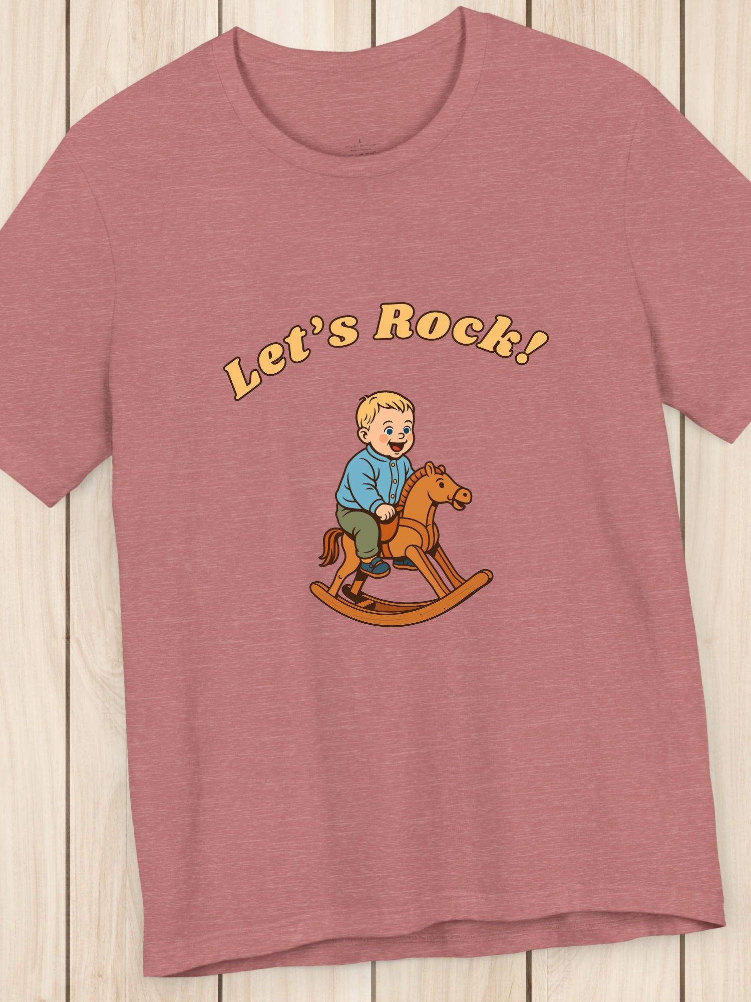 'Let's Rock!' Boy on a Rocking Horse Graphic Unisex T-Shirt. Printed on a quality Bella+Canvas 3001 T-Shirt.