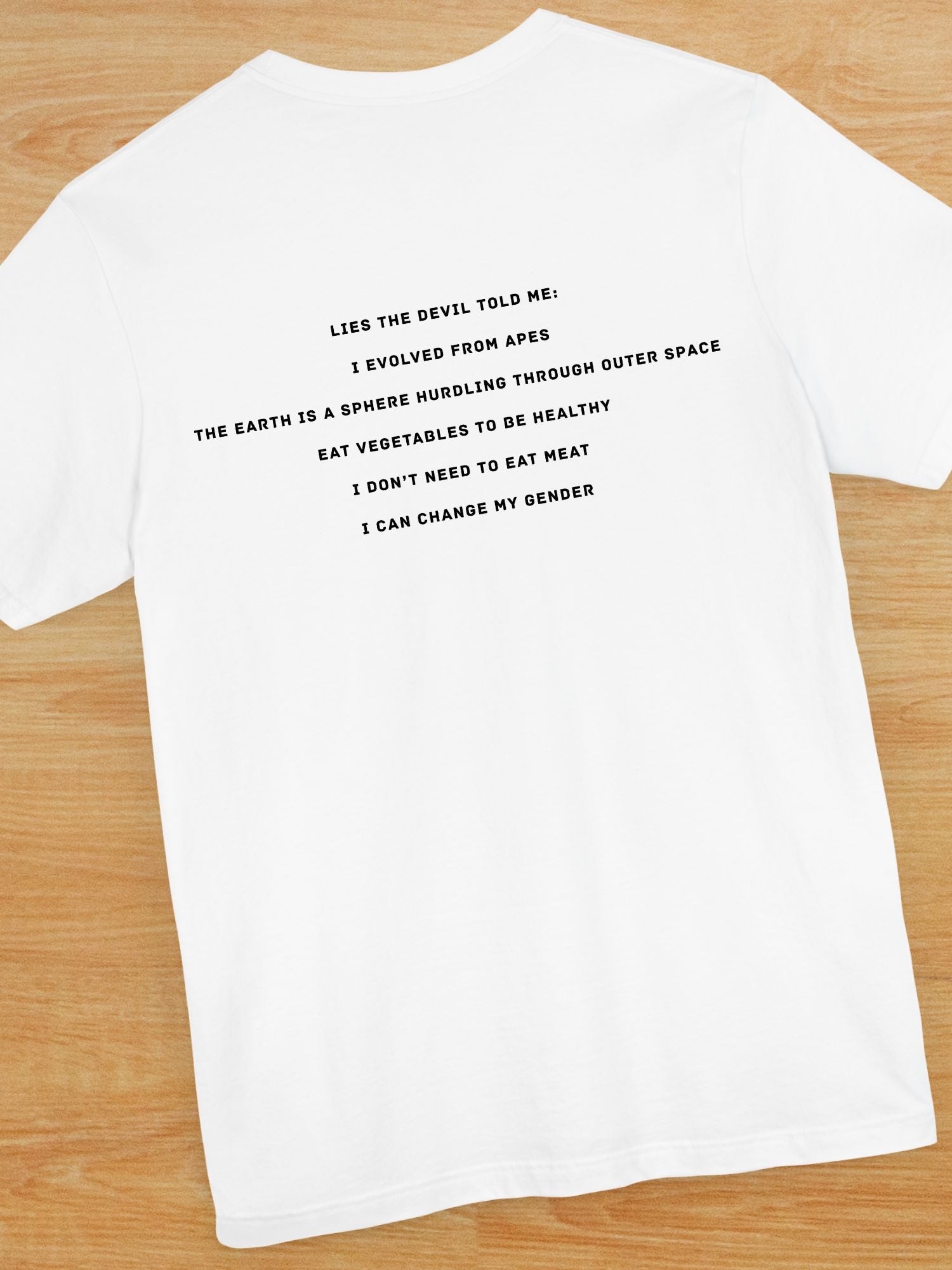 ‘Lies the devil told me: I evolved from apes. The earth is a sphere hurdling through outer space. Eat vegetables to be healthy. I don’t need to eat meat. I can change my gender.’ Unisex T-Shirt. Printed on a quality Bella+Canvas 3001 T-Shirt.