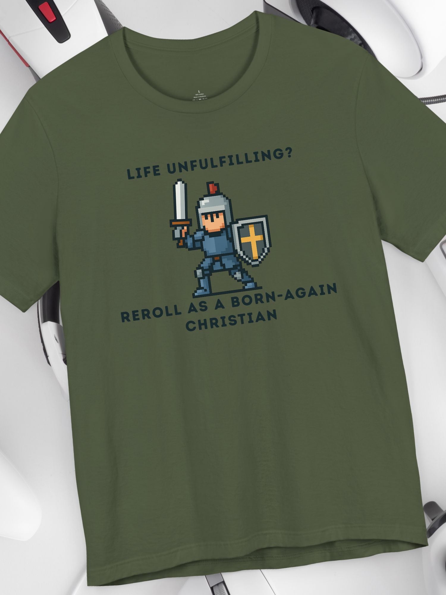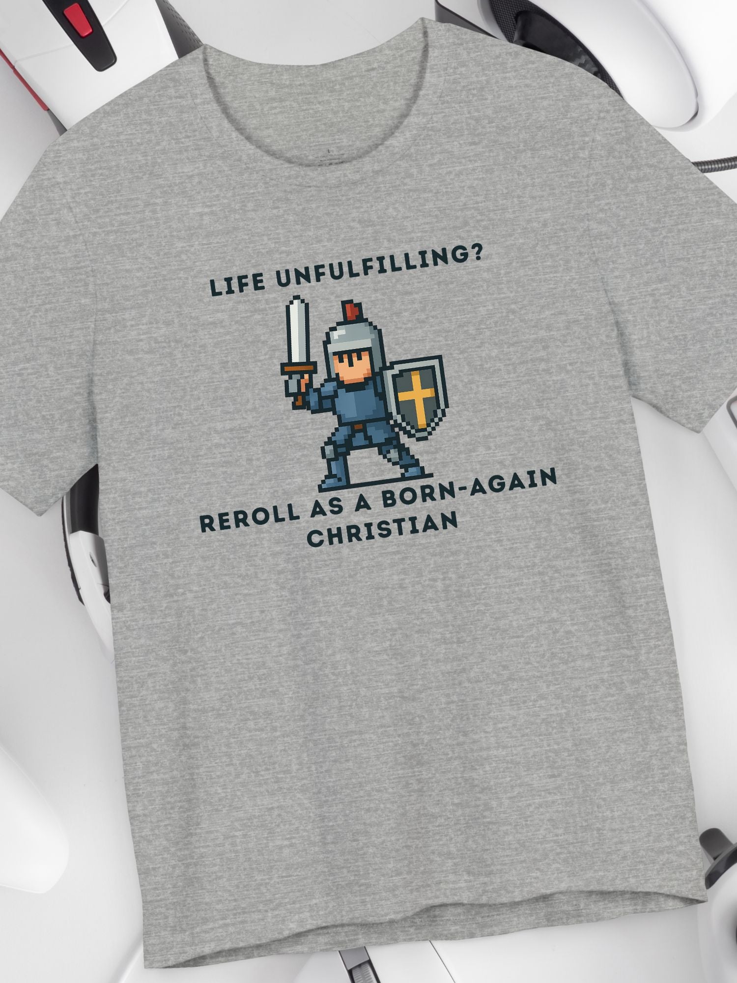 'Life Unfulfilling? Reroll as a Born-Again Christian' Unisex T-Shirt, Christian Gift, Religious Apparel, Gamer T-Shirt, Motivational Message