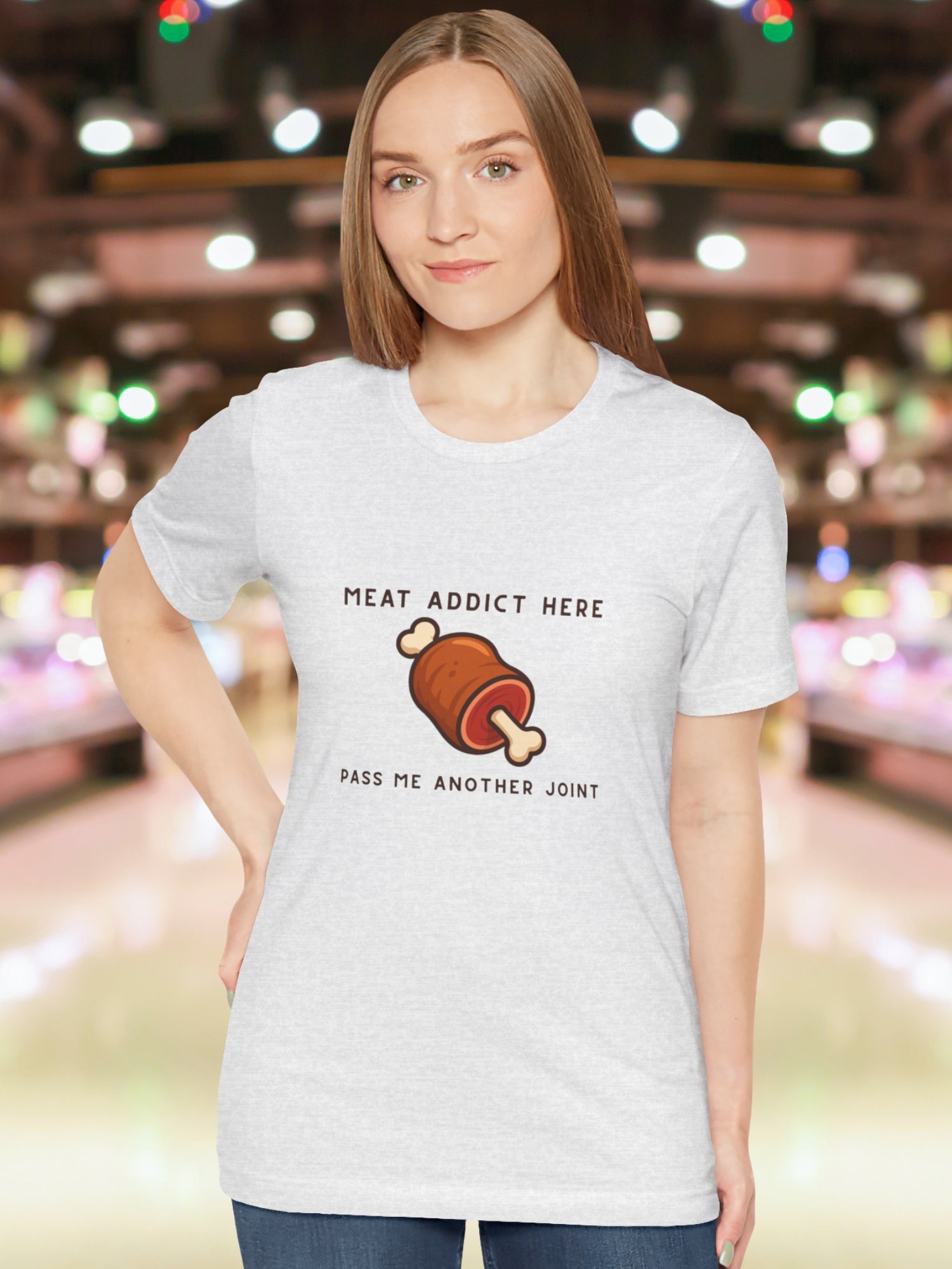 'Meat addict here, pass me another joint' Joint of Meat Graphic Unisex T-Shirt. Printed on a quality Bella+Canvas 3001 T-Shirt.
