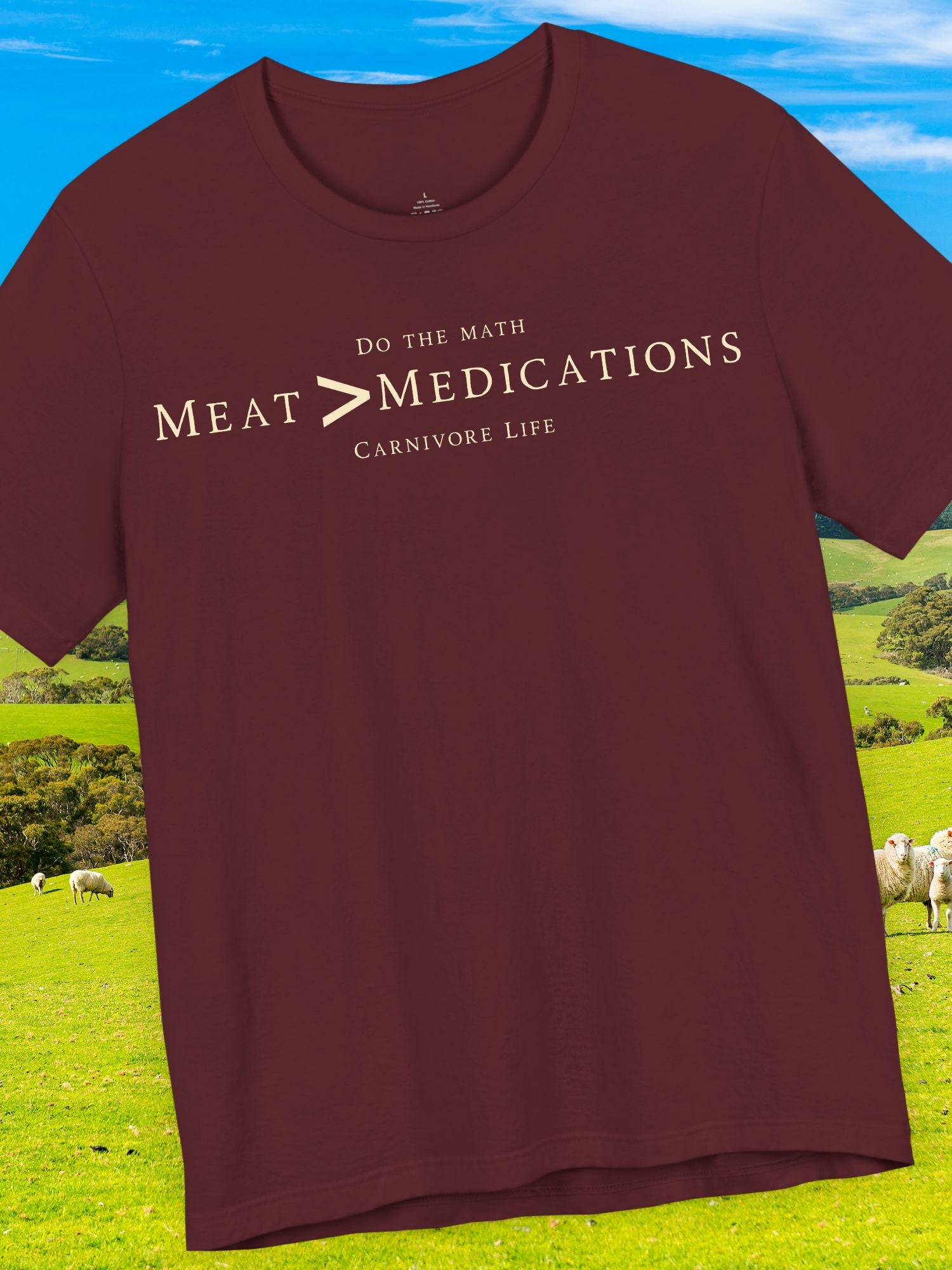 Meat Greater-than Medications Tee | Unisex Short Sleeve Shirt, Casual Wear, Carnivore Diet Apparel, Health Awareness