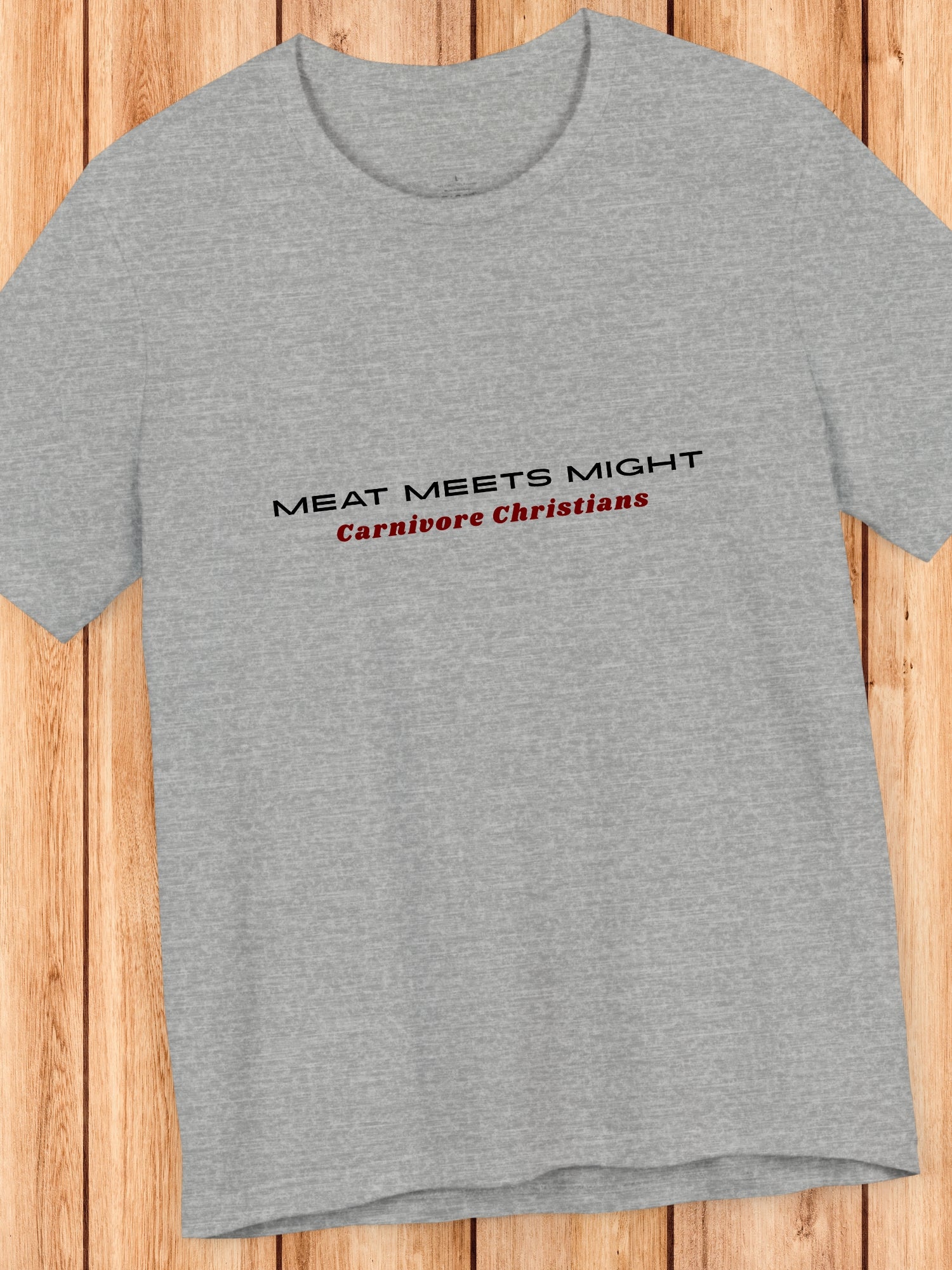 Meat Meets Might, Carnivore Christians, Unisex T-Shirt. Printed on a quality Bella+Canvas 3001 T-Shirt.