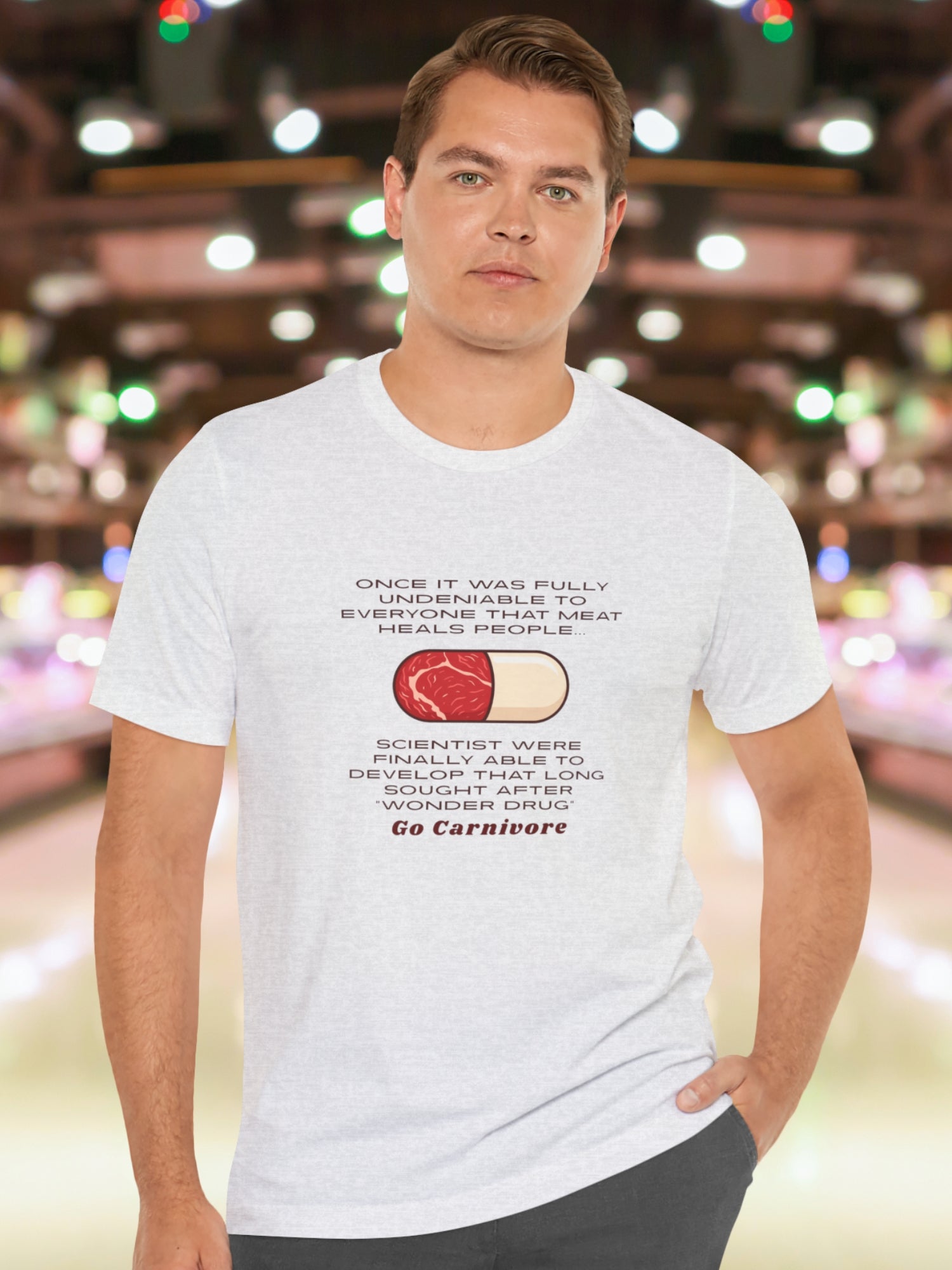 Meat "Wonder Drug", 'Go Carnivore' Pill Made of Meat Graphic Unisex T-Shirt, Health and Wellness, Carnivore Diet Apparel