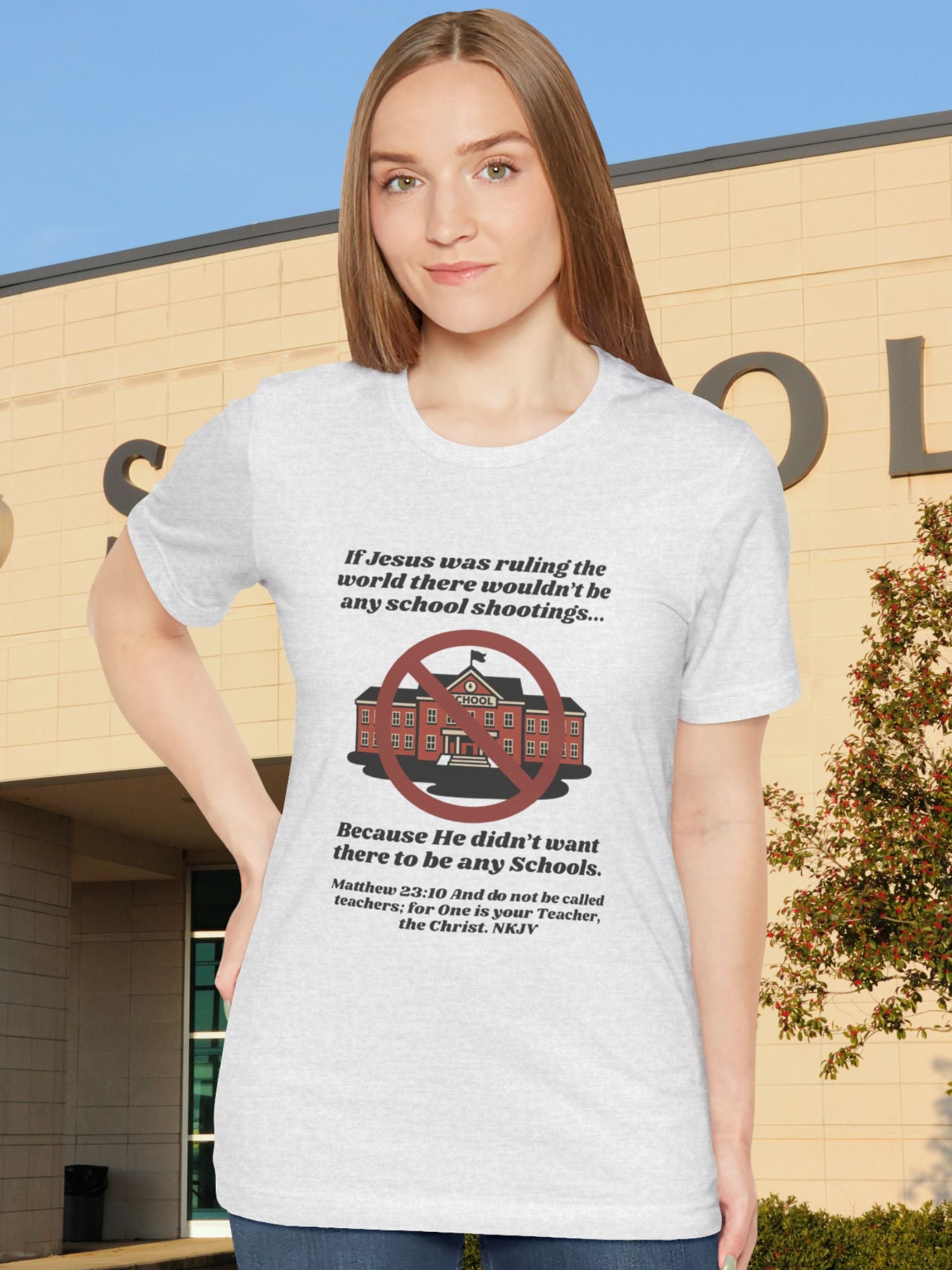 "If Jesus was ruling the world there wouldn't be any school shootings...Beause He didn't want there to be any schools. Matthew 23:10 And do not be called teachers; for One is your Teacher, the Christ." T-shirt. Printed on a quality Bella+Canvas 3001 T-shirt.