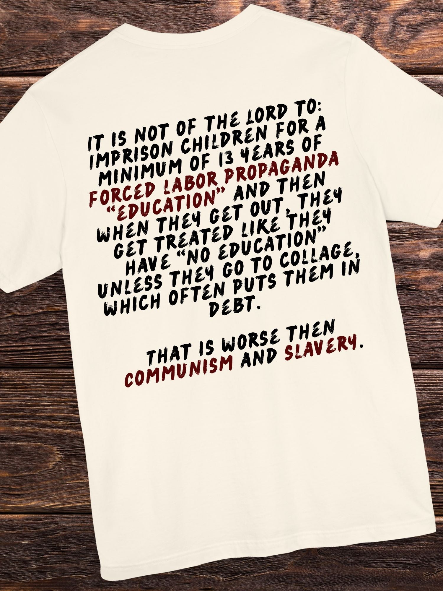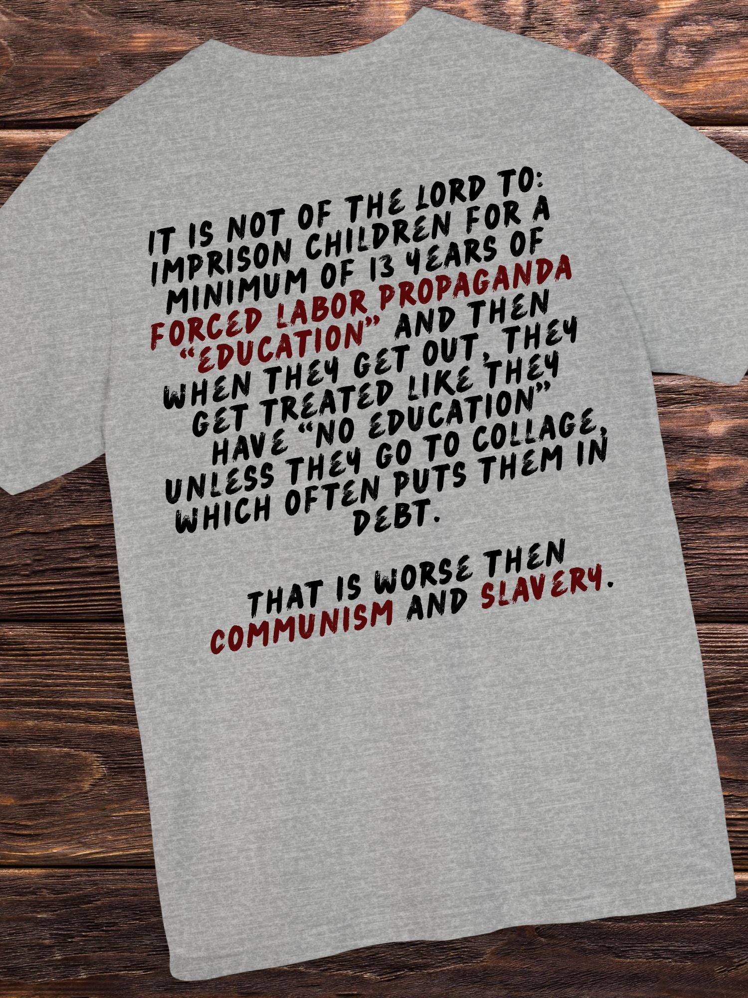 It is not of the Lord to: Imprison children for a minimum of 13 years of forced labor propaganda “education” and then when they get out, they get treated like they have “no education” unless they go to college, which puts them in debt, often for a job that doesn’t even exist. Unisex T-Shirt. Printed on a quality Bella+Canvas 3001 T-Shirt.
