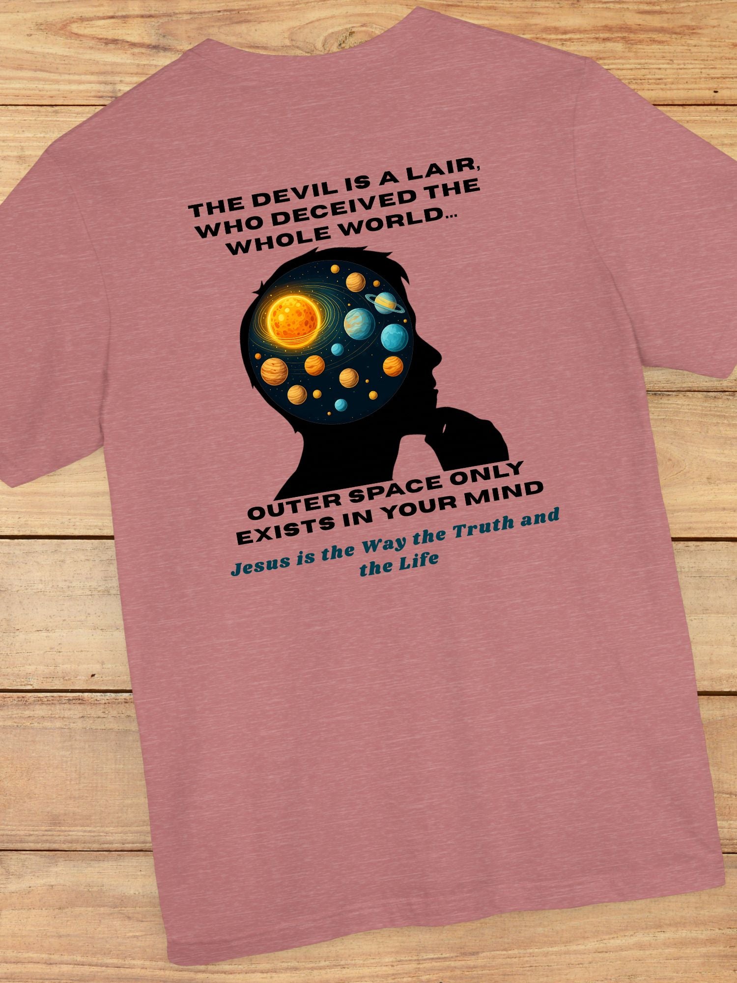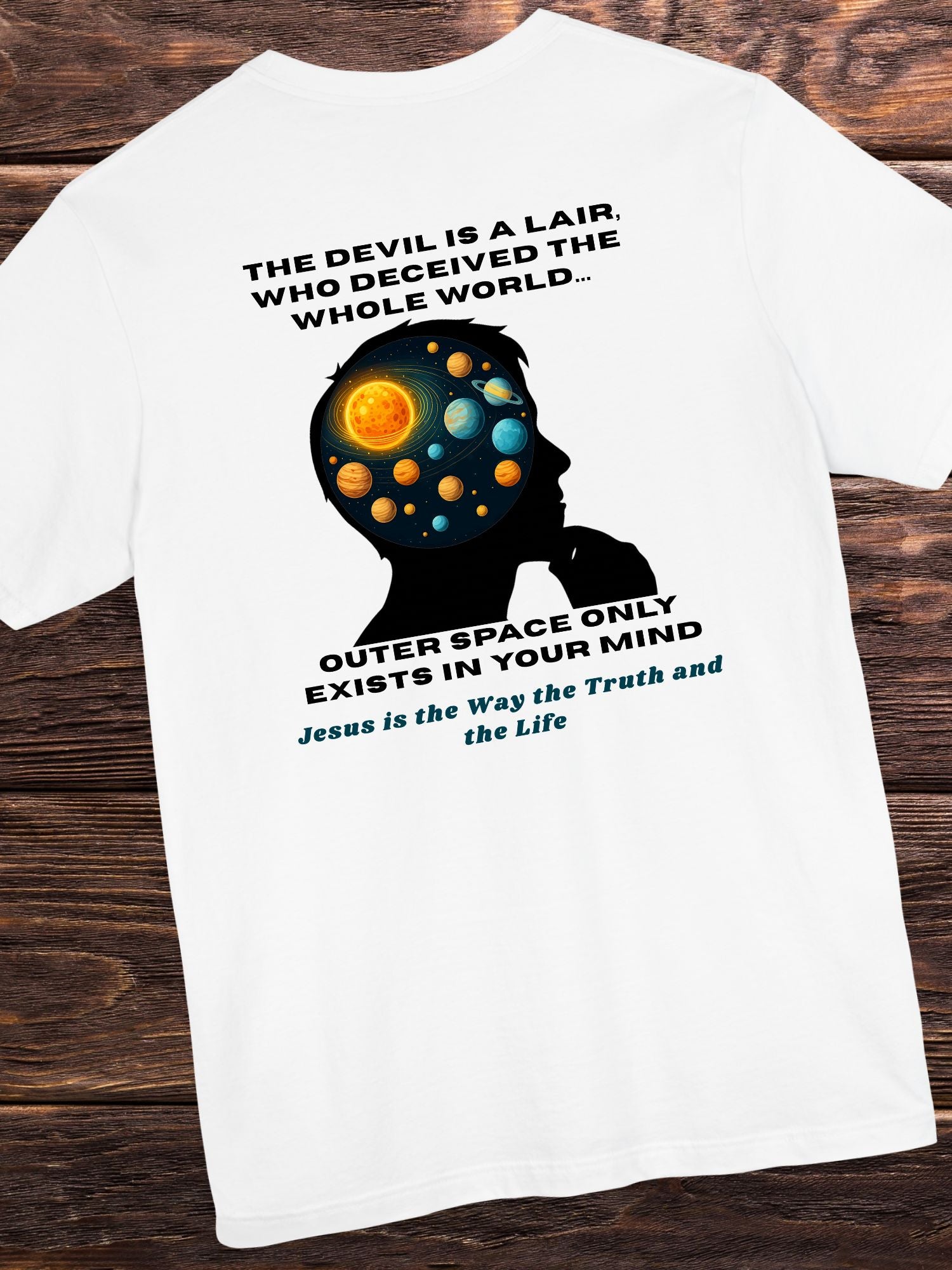 '... Outer Space Only Exists in Your Mind, Jesus is the Way the Truth and the Life' Space Mind Graphic Unisex T-Shirt. Printed on a quality Bella+Canvas 3001 T-Shirt.