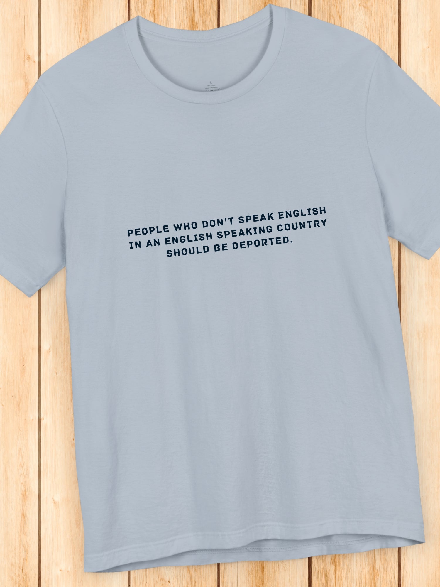 'People who don’t speak English in an English speaking country should be deported.' Unisex T-Shirt. Printed on a quality Bella+Canvas 3001 T-Shirt.
