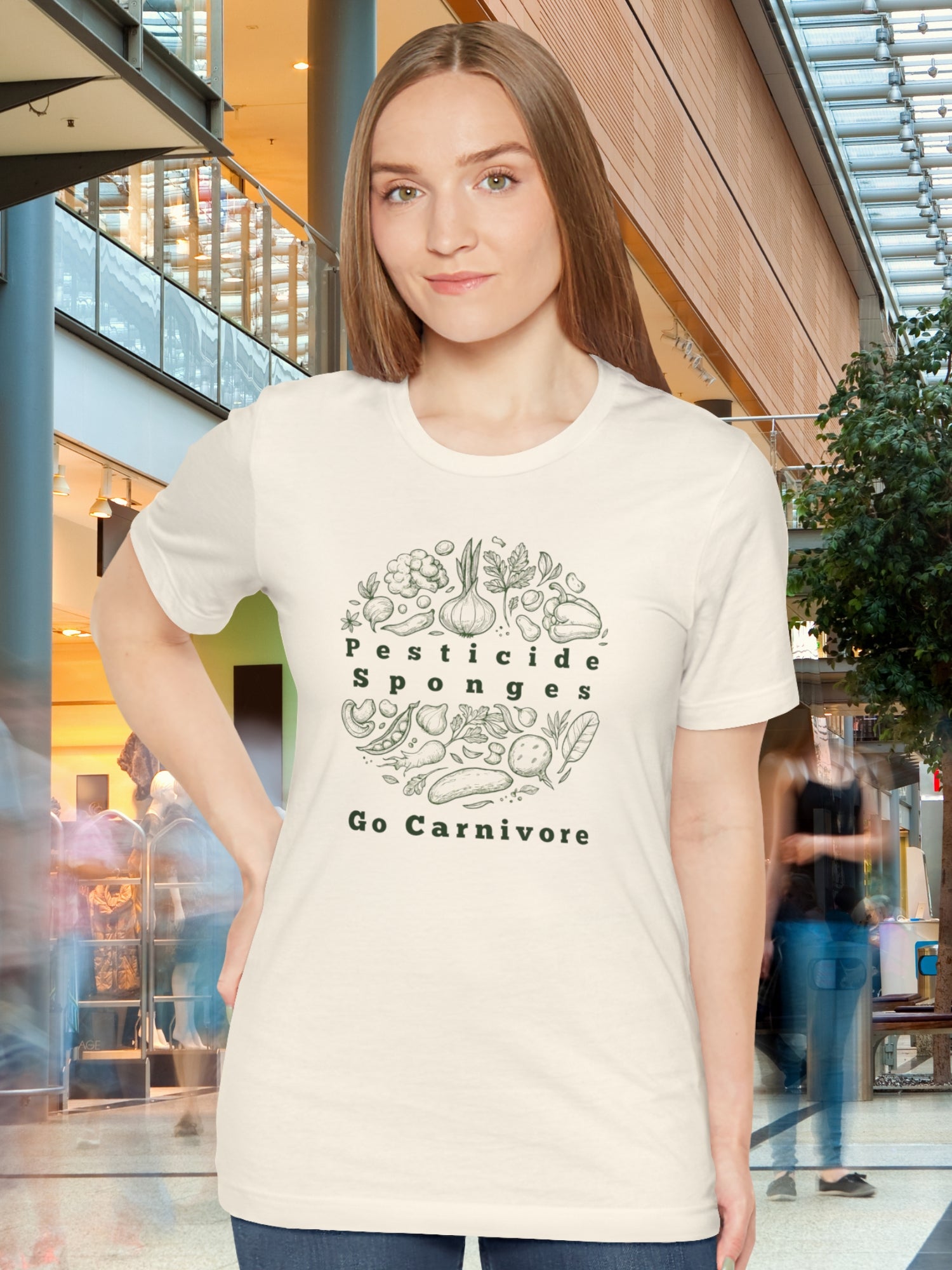 'Pesticide Sponges, Go Carnivore' Vegetable Graphic Unisex T-Shirt. Printed on a quality Bella+Canvas 3001 T-Shirt.