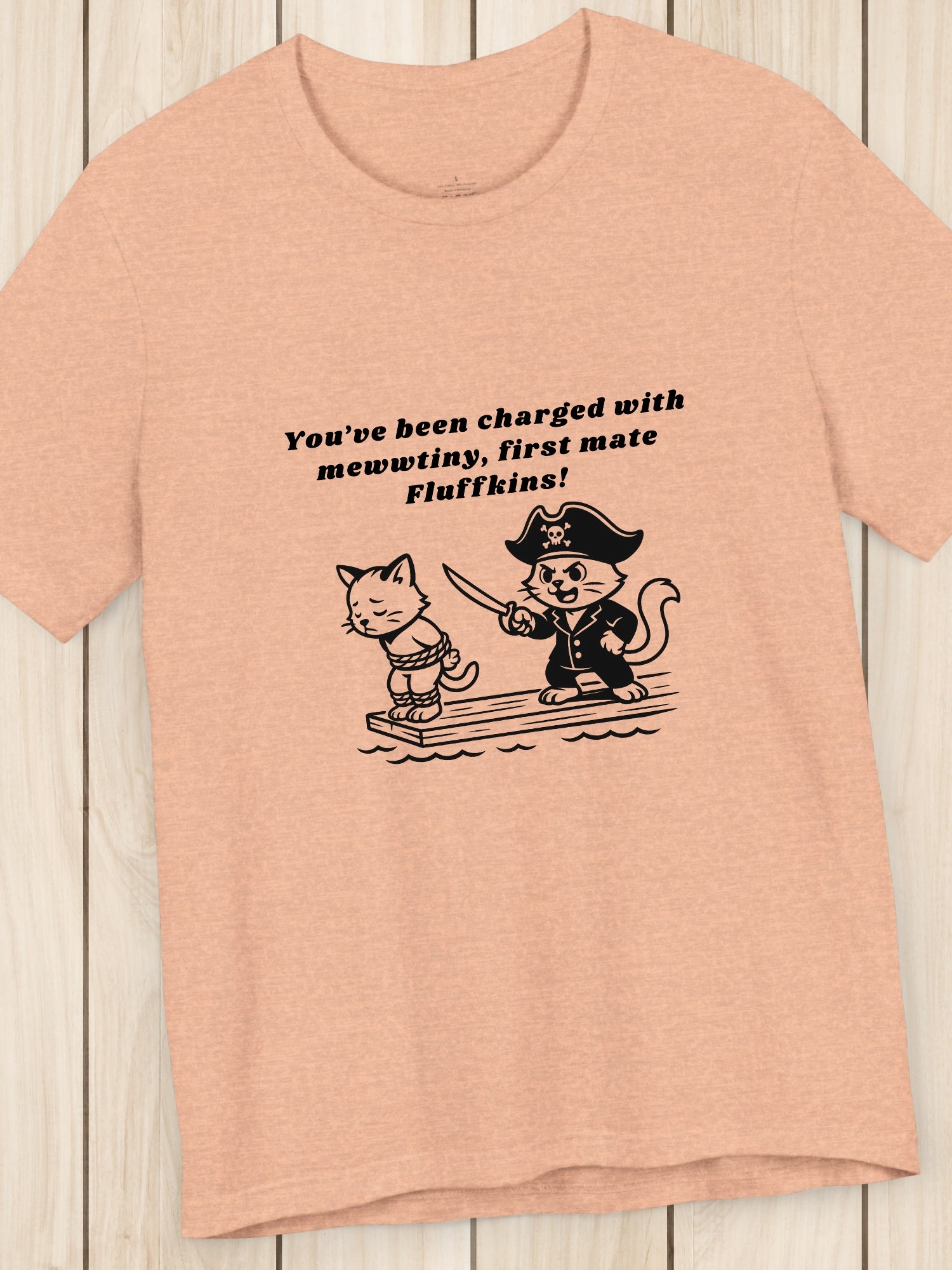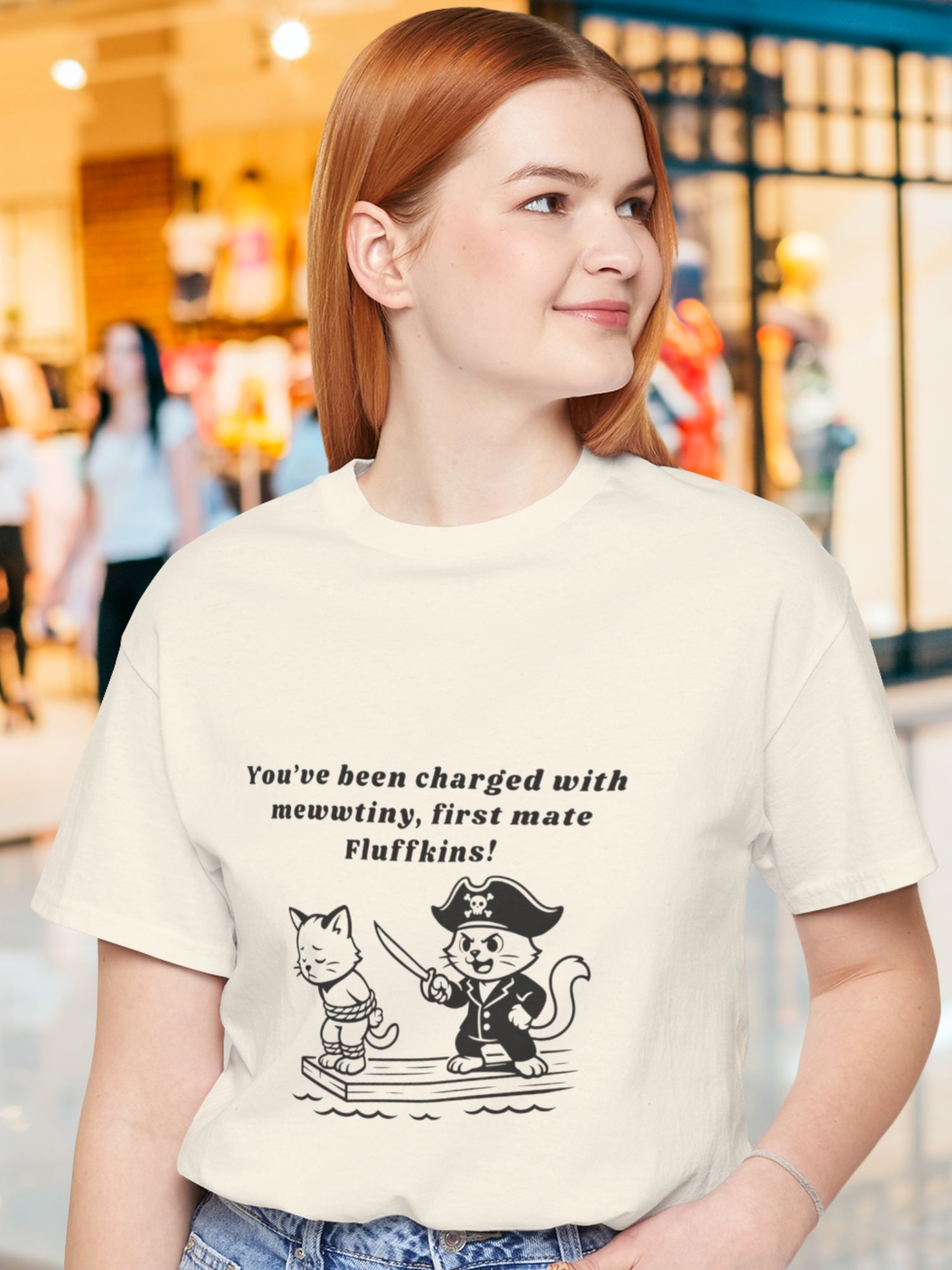 'You’ve been charged with mewwtiny, first mate Fluffkins!' Pirate Kittens Graphic Unisex T-Shirt. Printed on a quality Bella+Canvas 3001 T-Shirt.