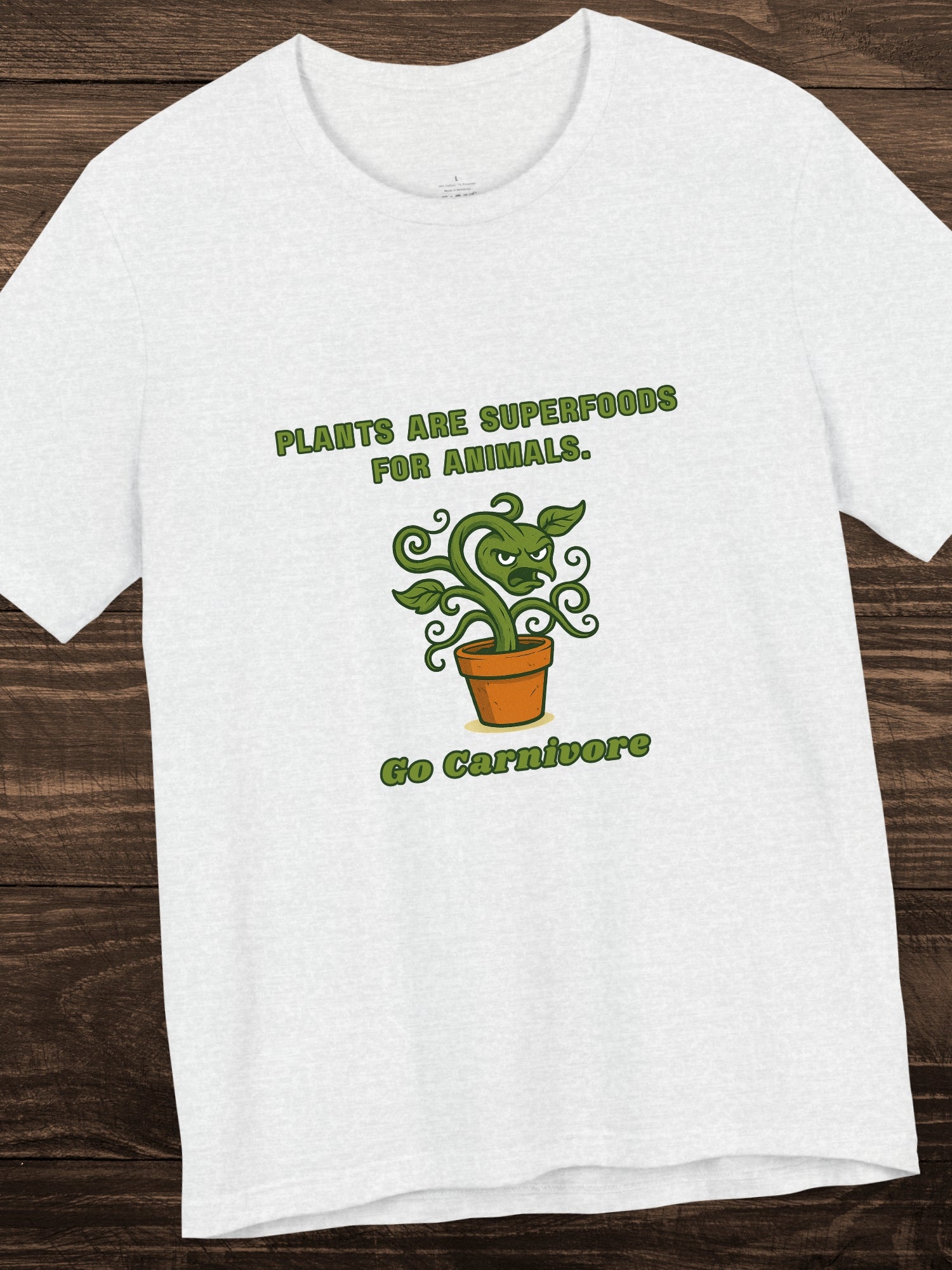 'Plants are Superfoods for Animals. Go Carnivore' Menacing Plant Graphic Unisex T-Shirt, Carnivore Diet Apparel, Health and Wellness