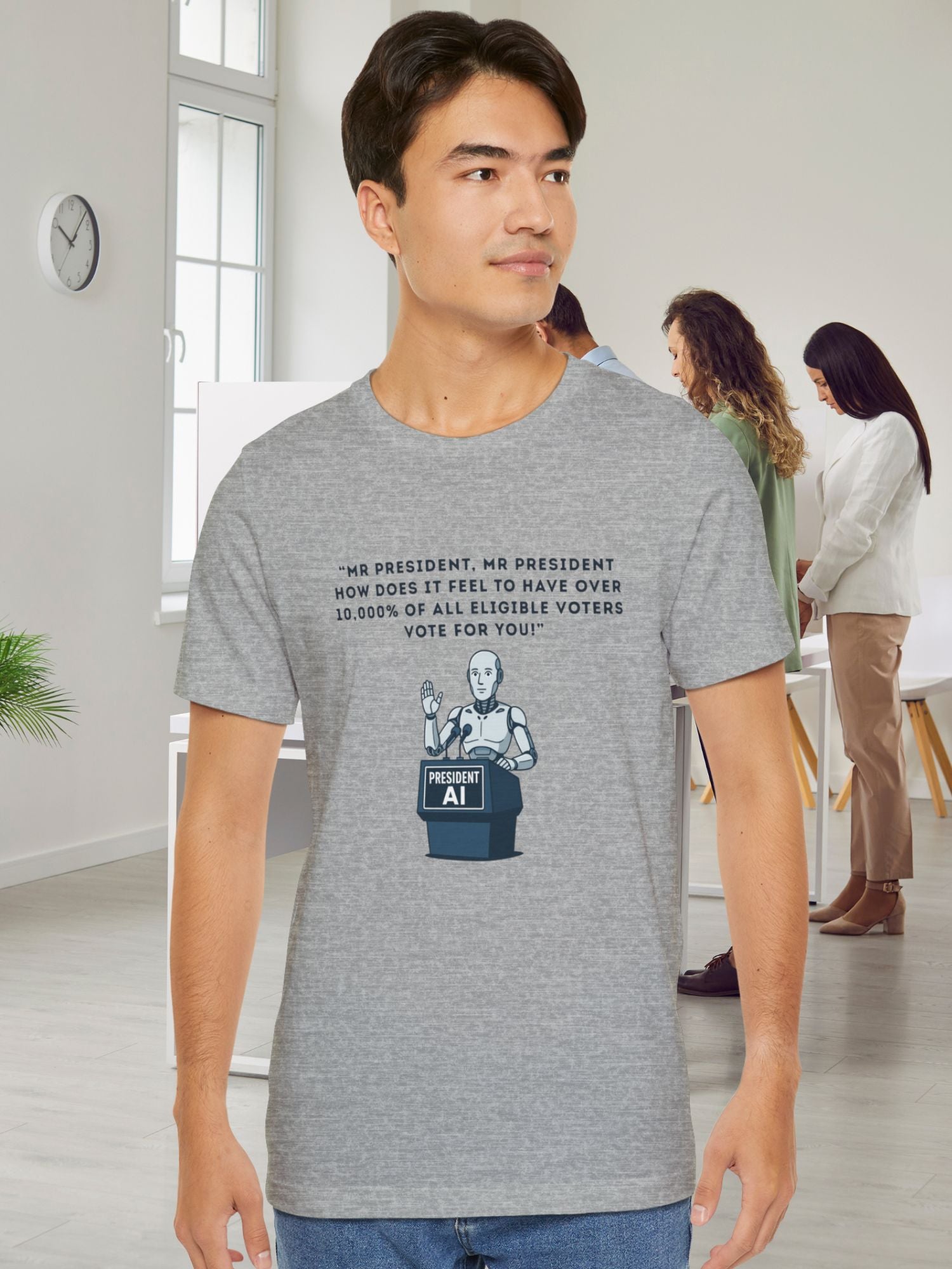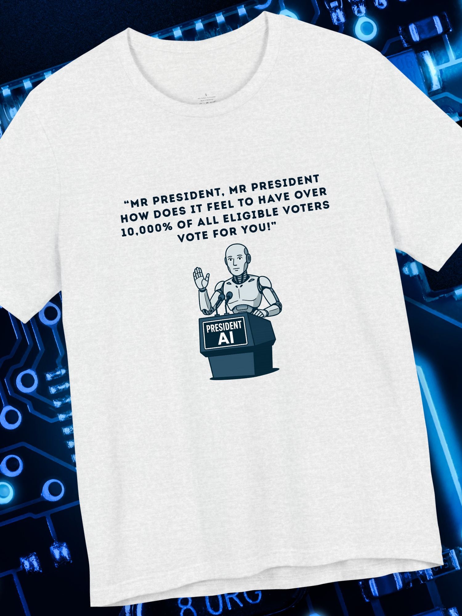 'President AI' Graphic Unisex T-Shirt. Printed on a quality Bella+Canvas 3001 T-Shirt.