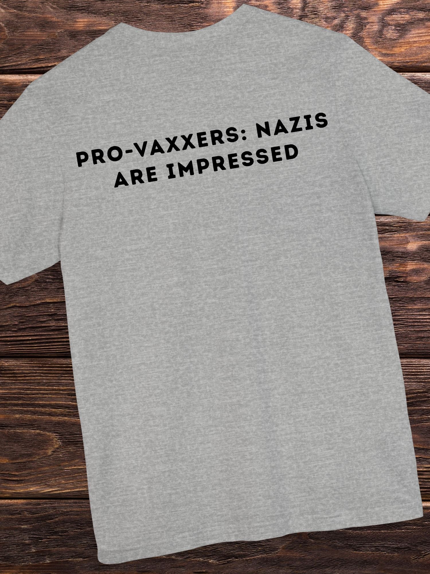 'Pro-Vaxxers: Nazis are Impressed' Unisex T-Shirt. Printed on a quality Bella+Canvas 3001 T-Shirt.