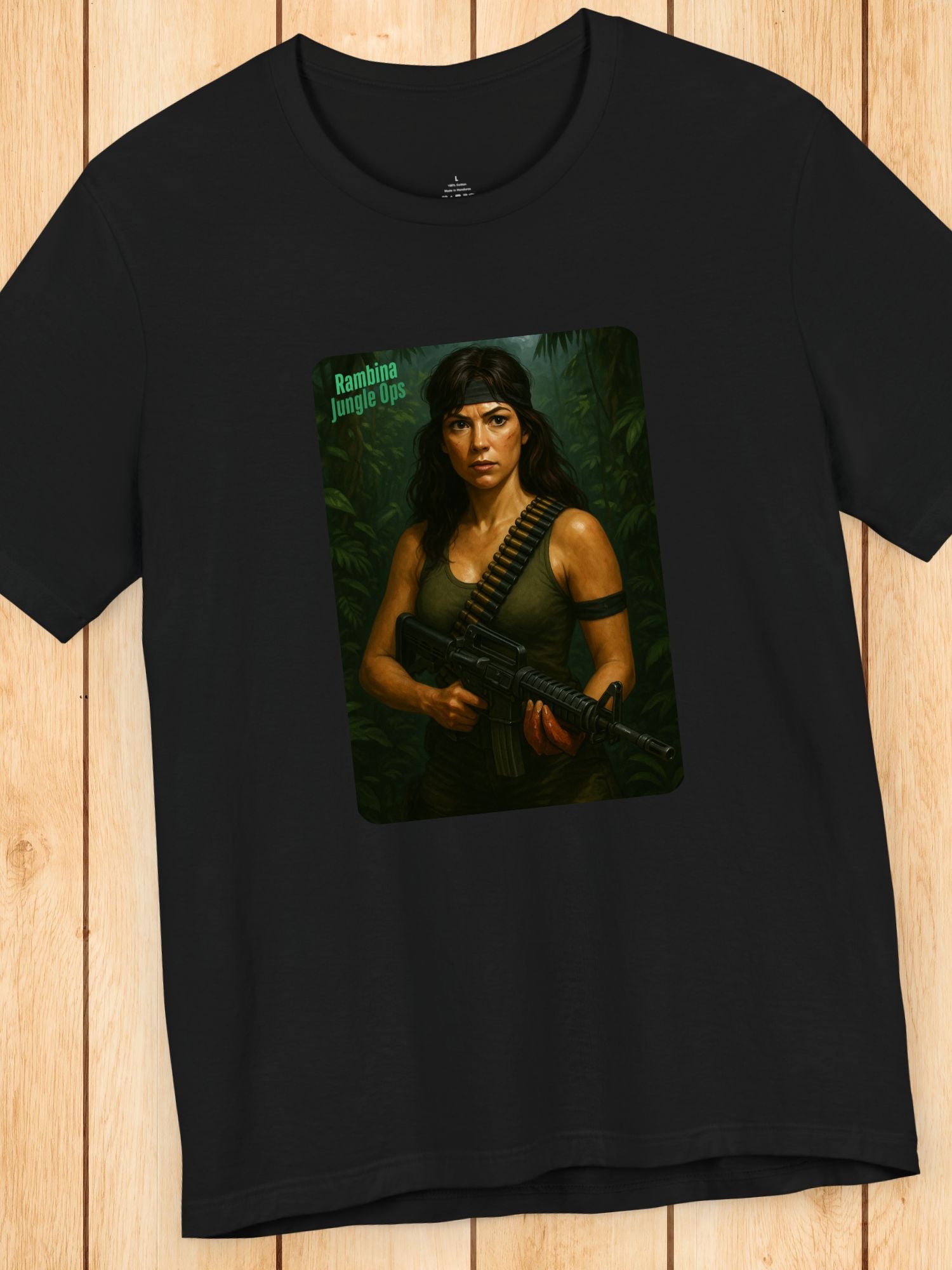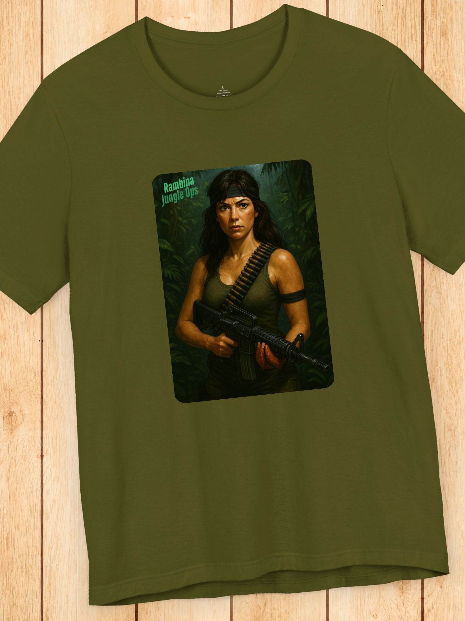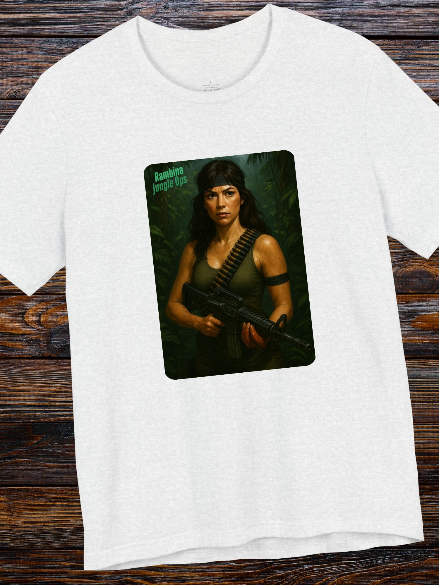 'Rambina Jungle Ops' Unisex T-Shirt, If you like fictional male special forces characters, how about a female one? Have the unique T-Shirt for this female action movie before the script for this movie has even been written, now that is a pre-release, how exciting! Printed on a quality Bella+Canvas 3001 T-shirt.