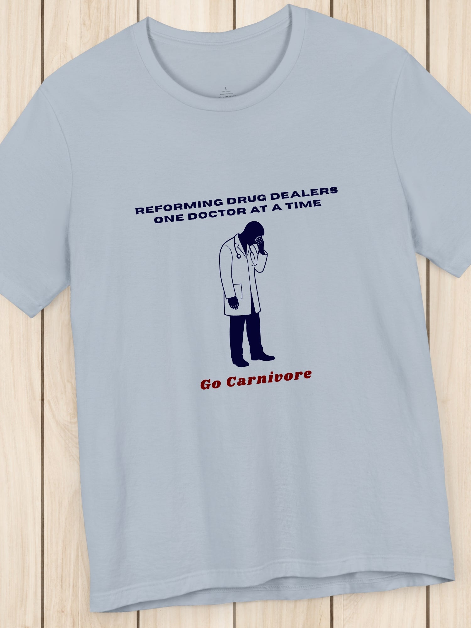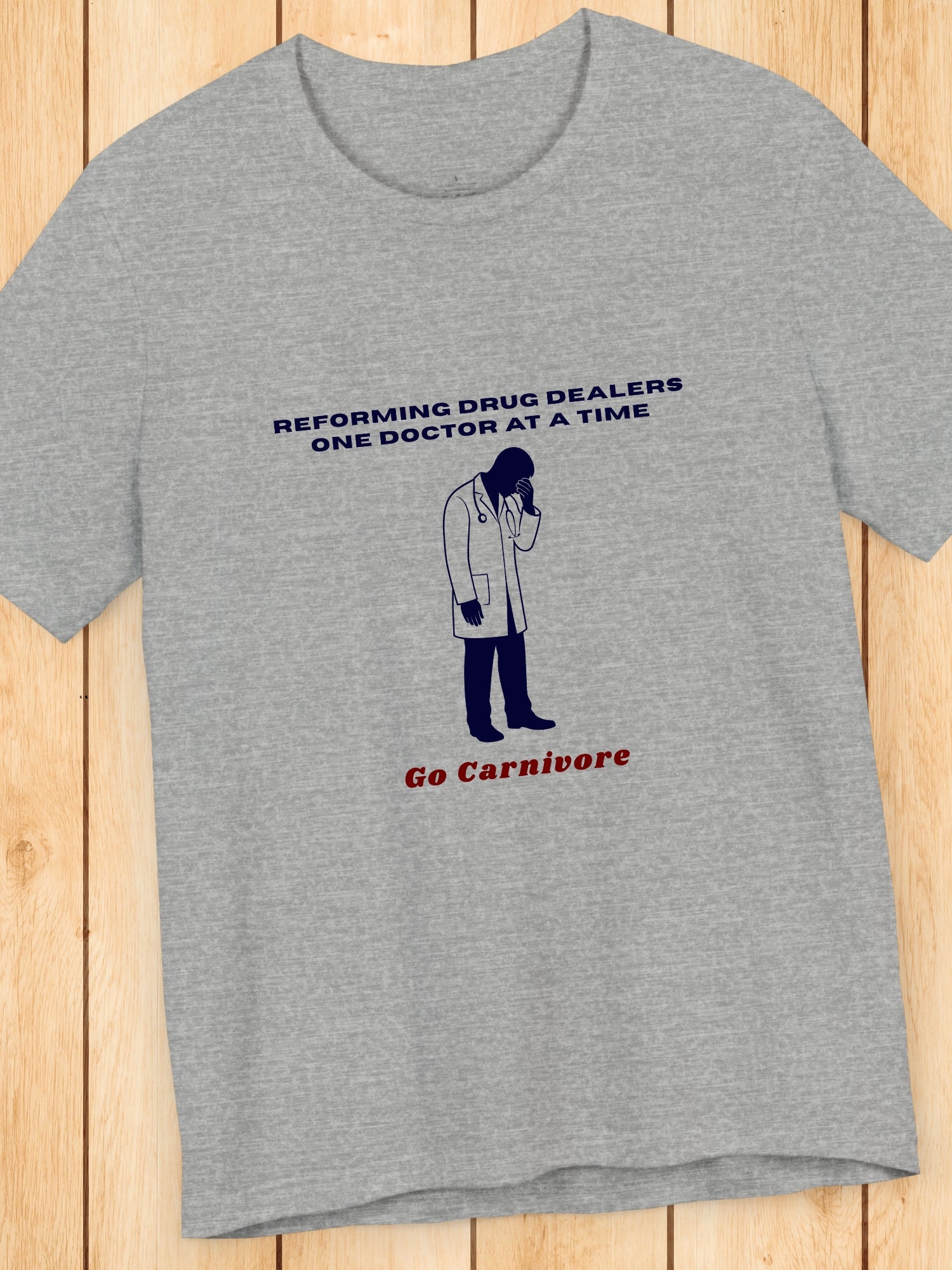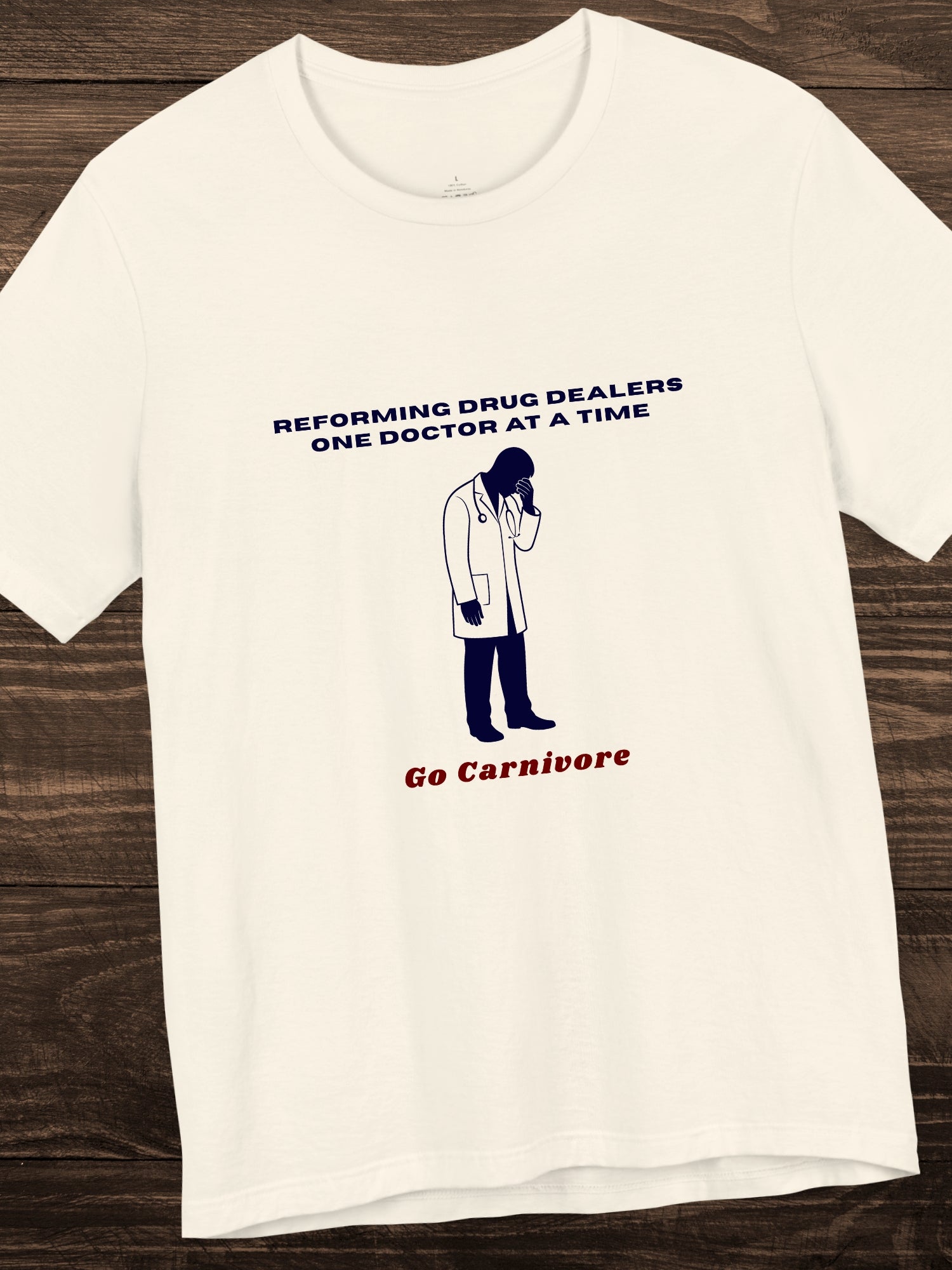 'Reforming drug dealers one doctor at a time, Go Carnivore' Ashamed Doctor Graphic Unisex T-Shirt, Carnivore Diet Apparel, Health and Wellness, Anti-Drug Abuse