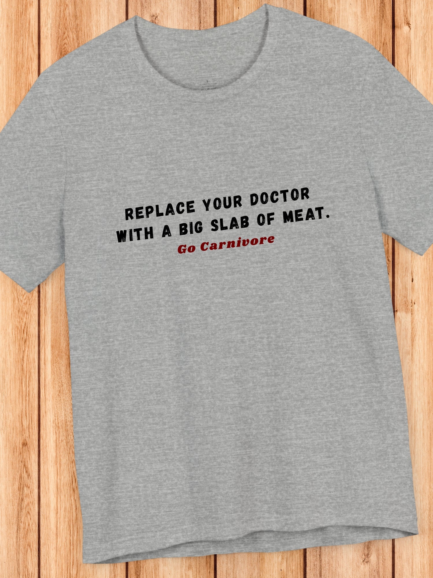 'Replace your doctor with a big slab of meat. Go Carnivore' Unisex T-Shirt. Printed on a quality Bella+Canvas 3001 T-Shirt.